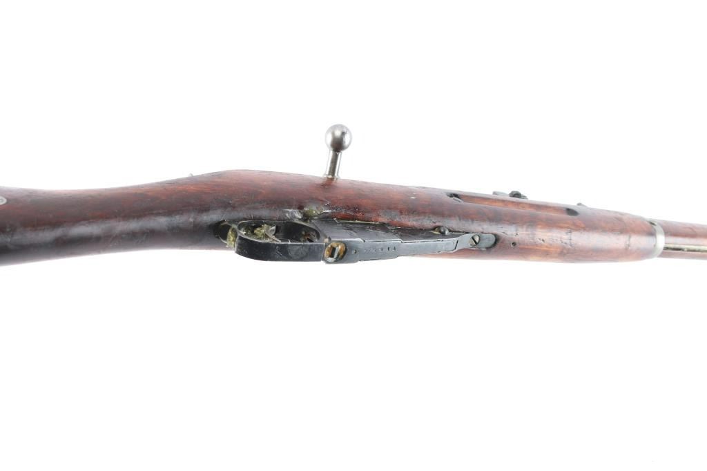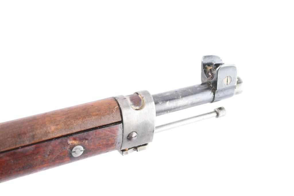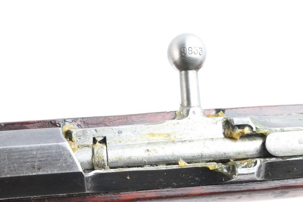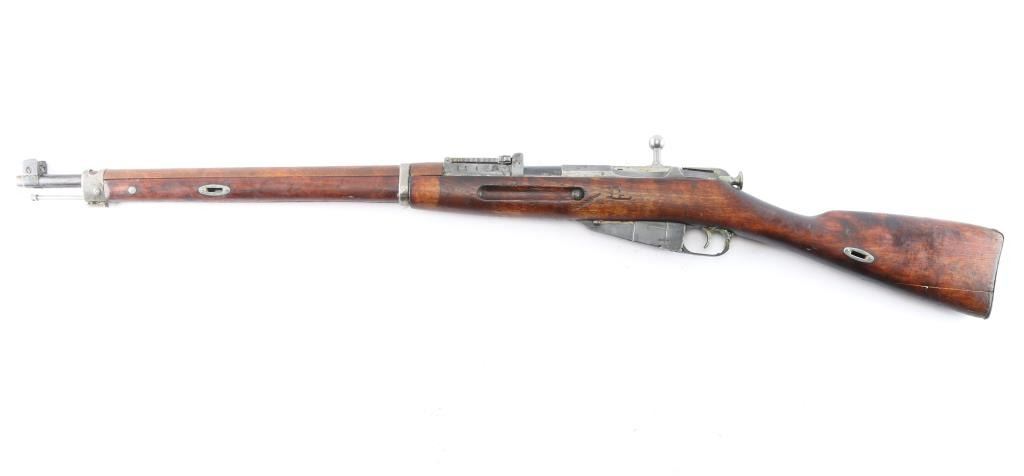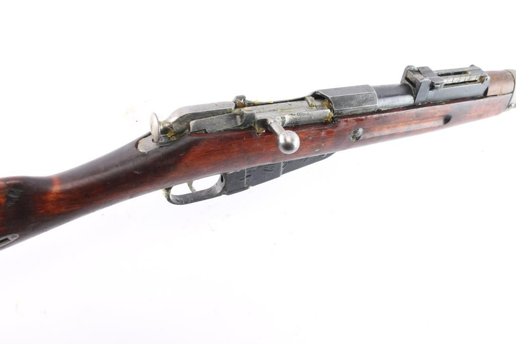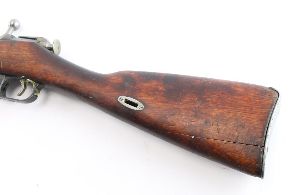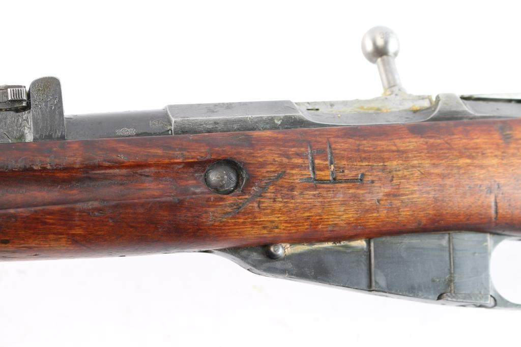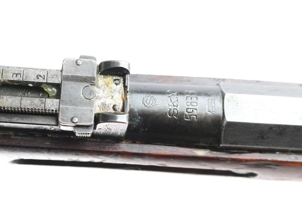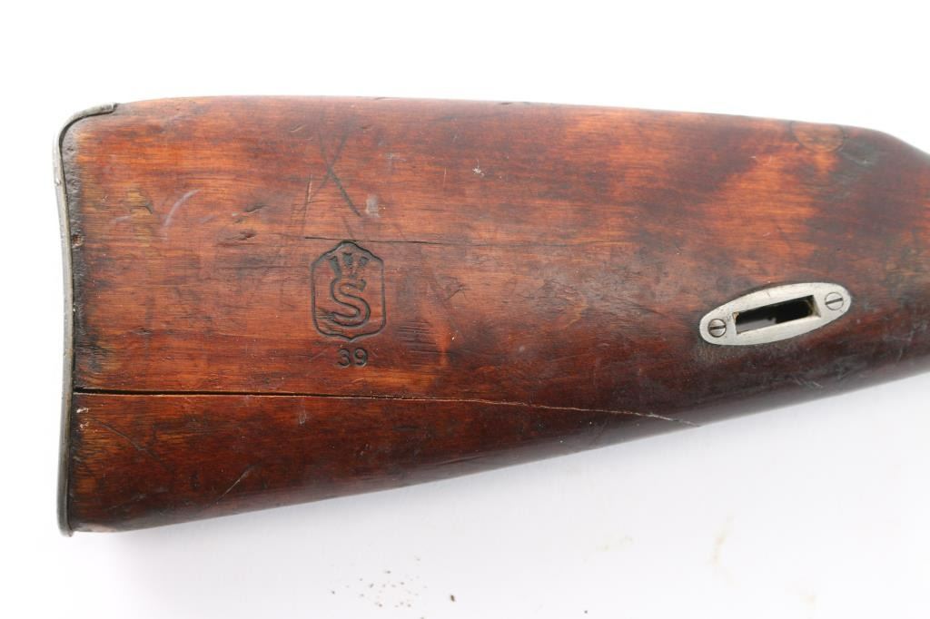 This is a Sako manufactured M28/30 bolt-action Mosin pattern rifle. The rifle is chambered for 7.62x54R. Manufactured for the Finnish Civil Guard in 1939, before importation by Marathon Products, Inc of Weth, CT. The rifle features the Sako manufacture stamp, as well as SA property mark, civil guard inventory # S110660, 1939 Sako proofing mark and various proofs correct to the manufacturing period. Stamping is crisp and clear, less the import mark behind the muzzle. The bolt handle knob is stamped 9833, consistent with the SN. The rifle features the correct front and rear sights introduced for the M28/30 pattern. The rear sight is a band mounted ramped rear with protective “ears”, which moves and adjusts freely. The front sight is a bladed sight protected by “ears” The sight blade is stamped ‘76’ matching the barrel stamping of the same just before the sight. The action is set in a Finnish two-piece stock, with a matching serial on the left butt, and manufacturers mark with ‘39’ on the right butt. The only visible repair is a wood plug above the rear sling stud on the right sid of the comb. The stock suffers an impressed score line starting on the left side of the forward sling stud, joining an indentation on stud, and moving rearward approximately 2.5”. The stock also bears impression markings from long term storage in a soft case in the finish on the left side of the butt. The upper handguard has a through crack, left of center spanning from the barrel band forward, approximately 4”, towards centerline. The is a second crack is visible at the middle of the upper handguard, starting at the centerline and forward approximately 5”, ending right of centerline. The two cracks are approximately 2” from joining. The upper handguard has also suffered from shrinkage allowing it to rotate with approximately 1/8” of gap. The stock has a crack suffers a horizontal split stemming from under the butt plate, that runs through, but is held in place without separation. The stock remains serviceable, but carries various depressions and some heavy scarring and a symbol carved into the left side, behind the cross bolt. Rifle is complete with cleaning rod, and bore remains heavily packed with shipping grease.