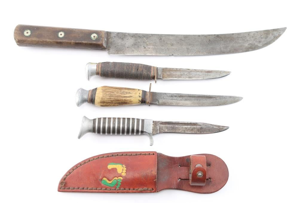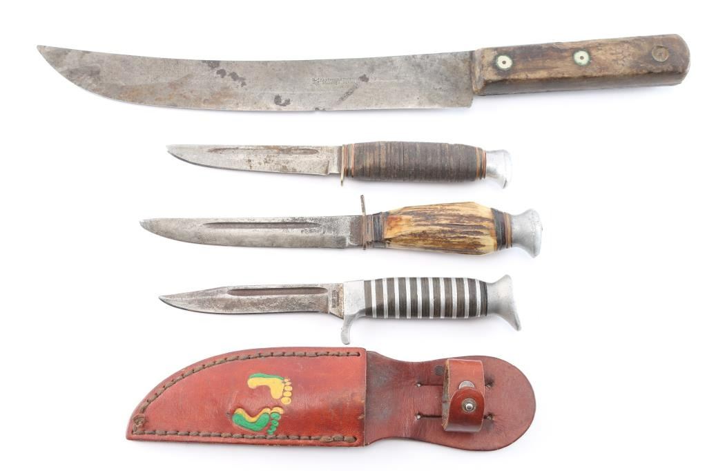 (1) J.A. Henckels, Twinworks, Solingen German 11" blade, 16-1/4" overall. (1) Schmidt-Ziegler, Soolingen Germany, 4" blade, 8-1/2" overall. (1) Stag handle, Solingen Germany, 5" blade, 9-1/2" overall. (1) Robeson Germany with leather sheath, 4" blade 8-1/2" overall.