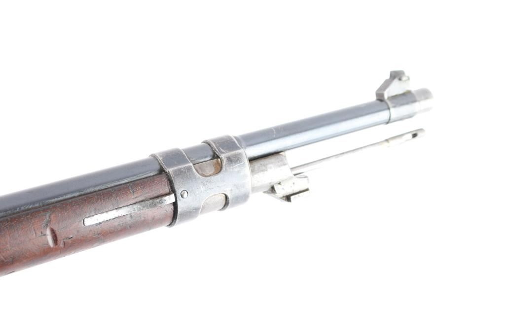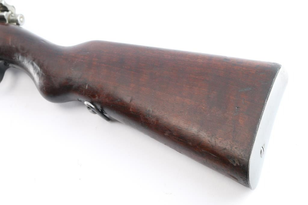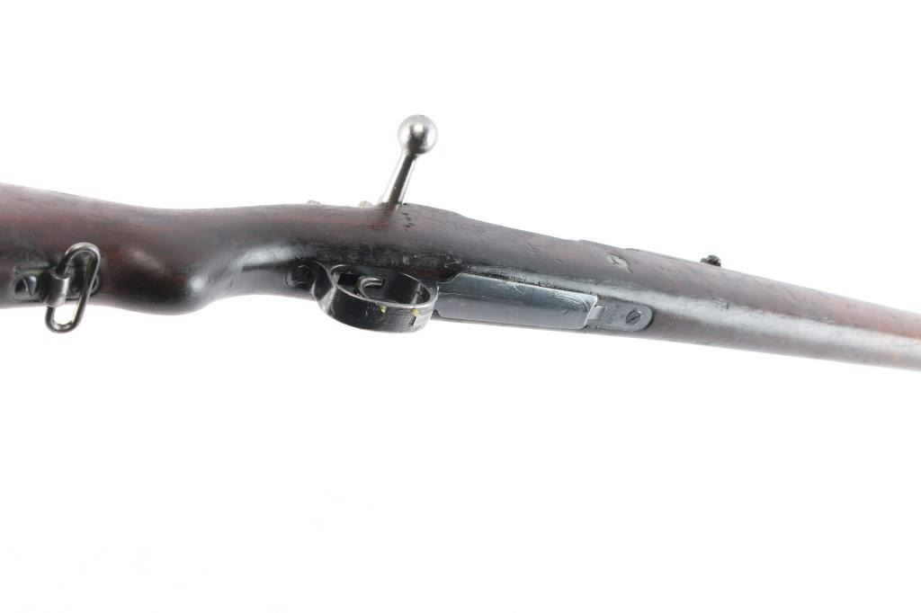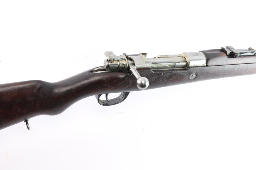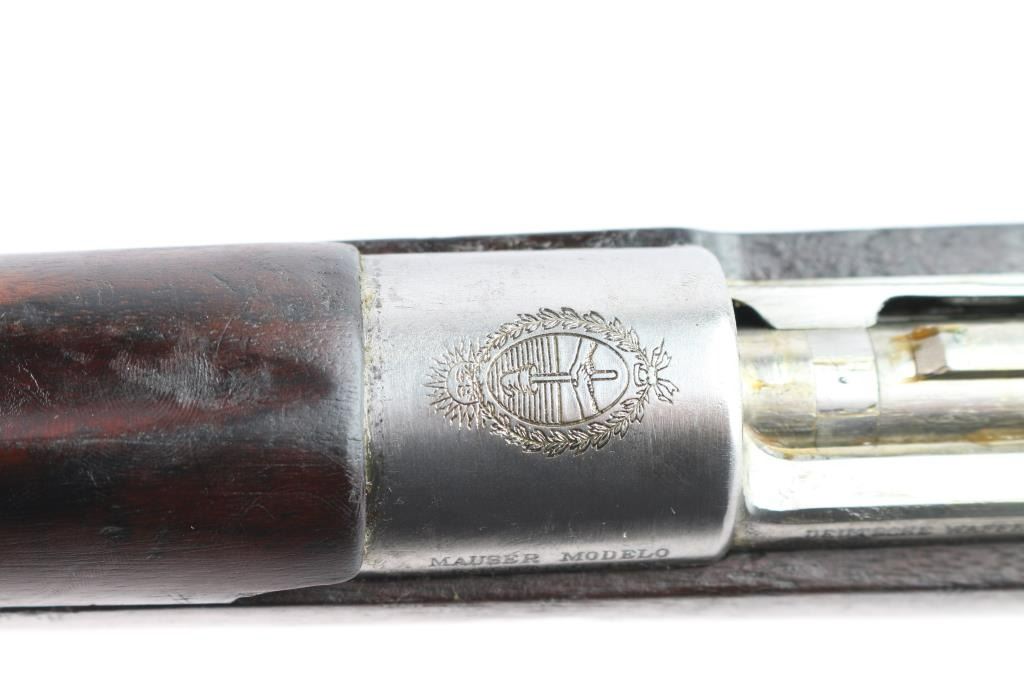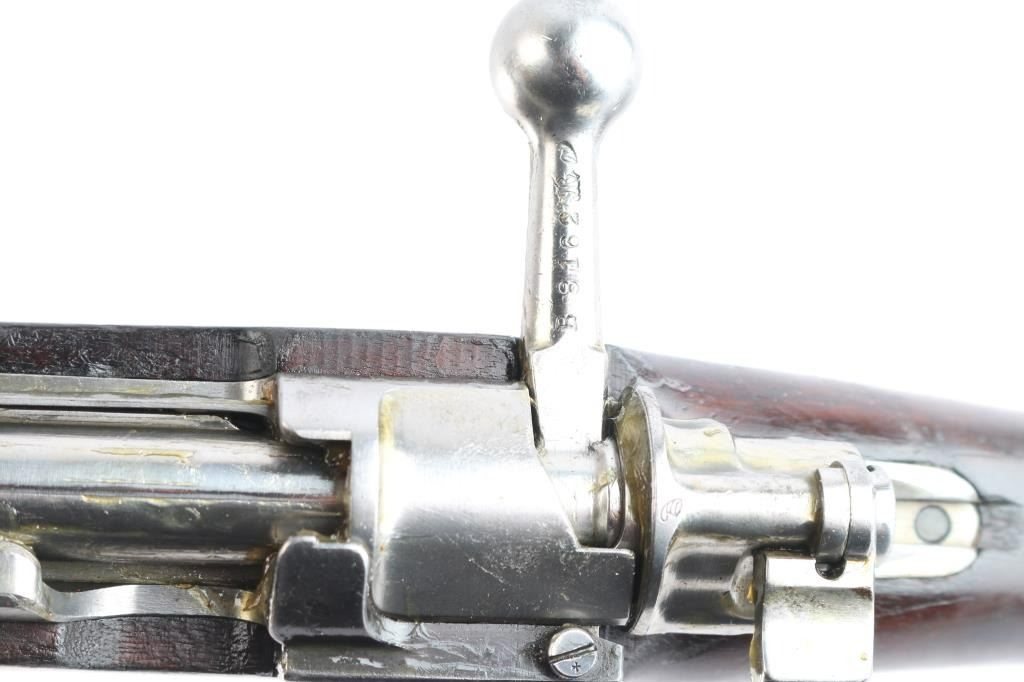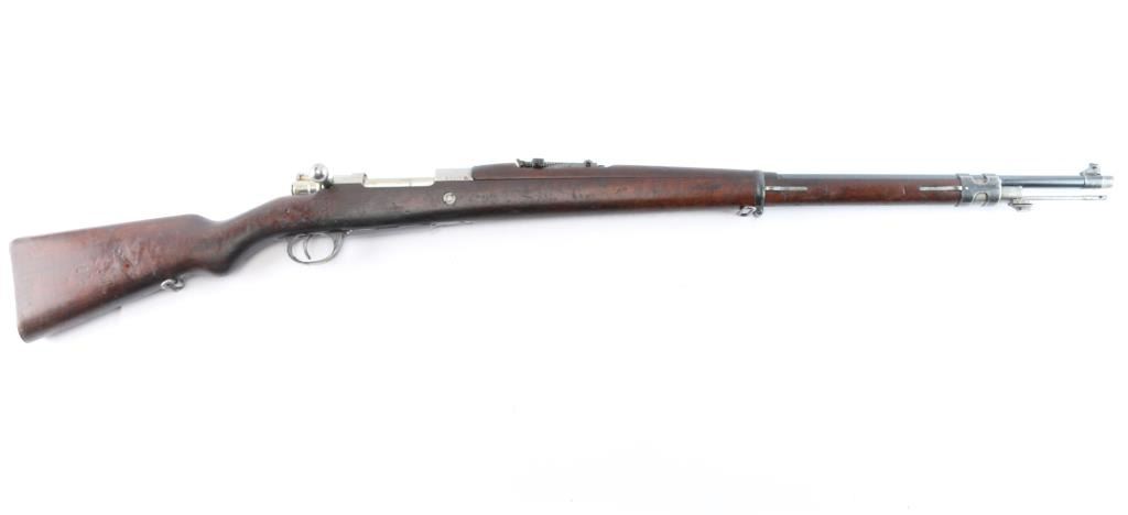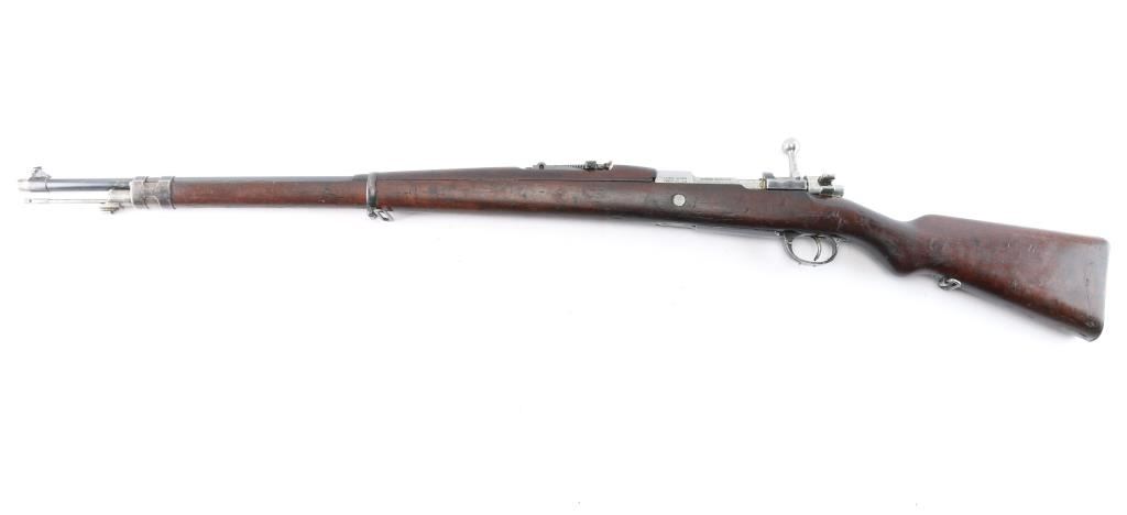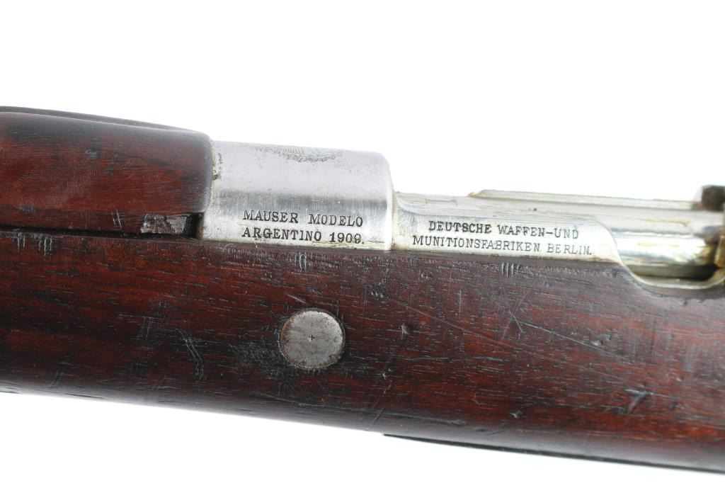 Bolt-Action Argentinean military contract rifle chamgered in 7.65x53mm Mauser, manufactured by DWM in Germany, and imported by Samco, Miami FL (marked under barrel). Receiver ring stamped with Argentinean crest and "Mauser Modelo Argentino 1909". DWM, Berlin markings on right side of receiver. it features a 29" barrel, straight bolt handle, inverted 'V' front sight, tangent rear sights graduated to 2000 meters, sling swivels, bayonet lug, five round magazine with hinged floorplate, almost full-length semi-pistol grip stock, smooth curved trigger, flat buttplate, and cleaning rod under barrel. Matched serial numbers on receiver, bolt, trigger guard, cleaning rod, and stock. Bore is full of cosmoline and condition cannot be determined. Retains 95% blued finish. Receiver, buttplate, bayonet lug and bolt are in-the-white. Wood is in very good condition with normal handling wear and few observed small dents, and scratches. Action is crisp/tight.
