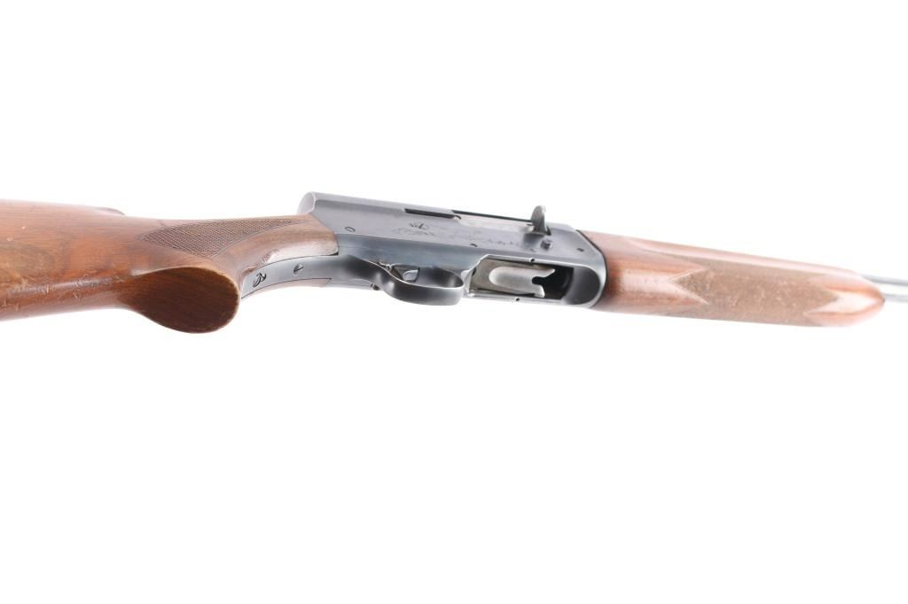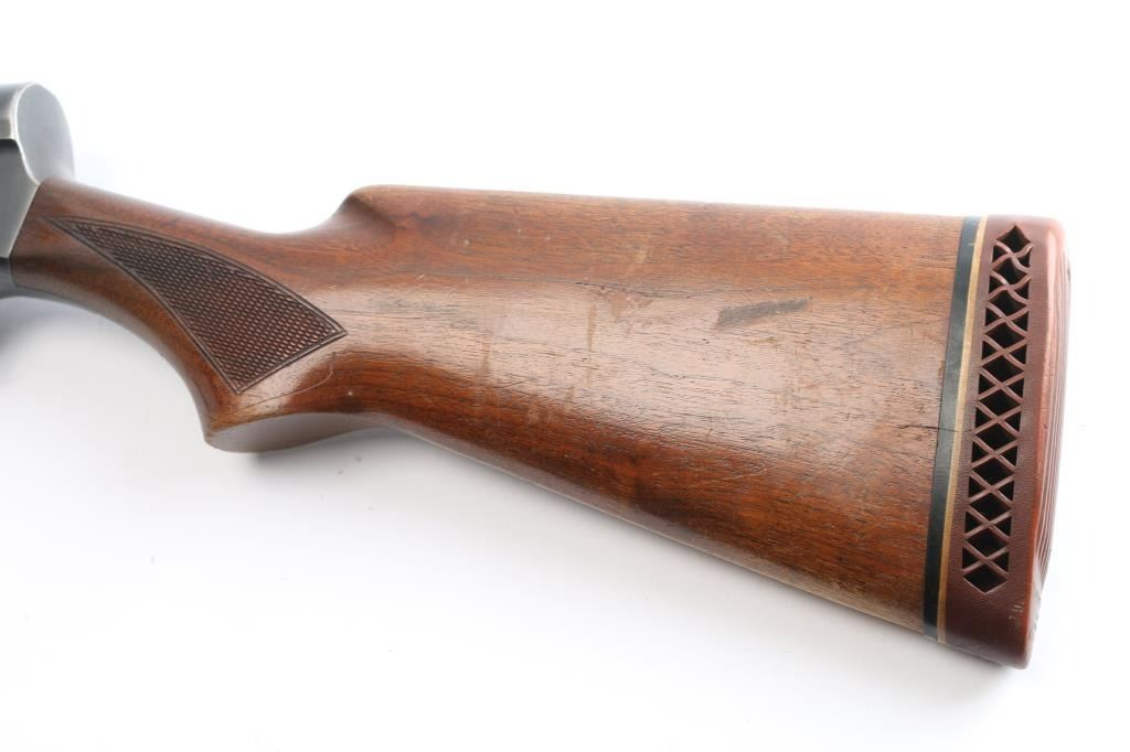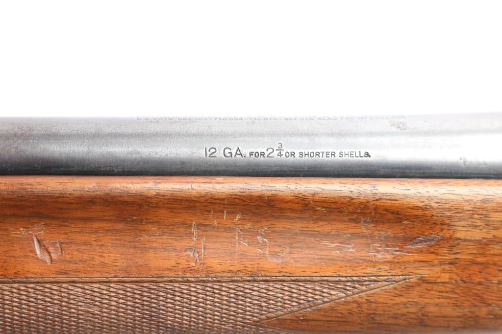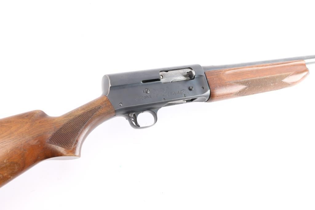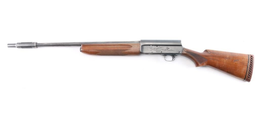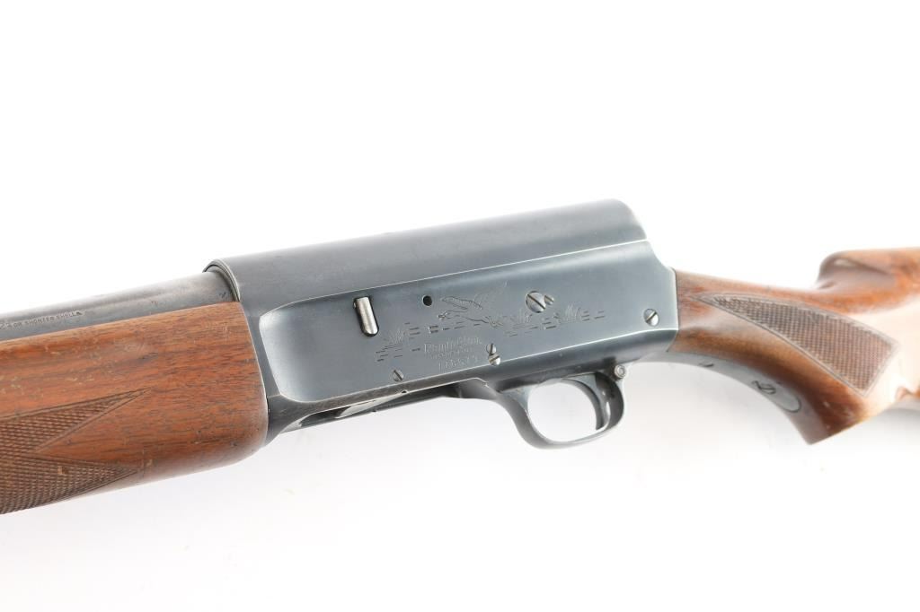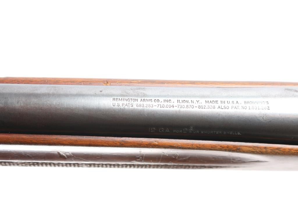 Vintage Remington Arms Co. semi-automatic 12 gauge shotgun with a 2 3/4" chamber, manufactured 1947 in Ilion, NY (PSS stamped on barrel). Blued finish, checkered wood semi- pistol grip stock, checkered forearm, brown vented rubber recoil pad, 27 3/4" barrel with a Lyman Cutts compensator, compensator measures 'CYL' with drop-in gauge, steel beaded front sight, smooth curved trigger, and push button safety. Game scenes on both sides of the receiver. Classic Browning long recoil action. Wood is good overall with normal handling wear being light scratches, dings, and finish wear around the grip area and the end of the buttstock. Bore and action are excellent. Original bluing is about 90% with edge wear on the receiver, very light scattered rust on the barrel. LOP is 14",