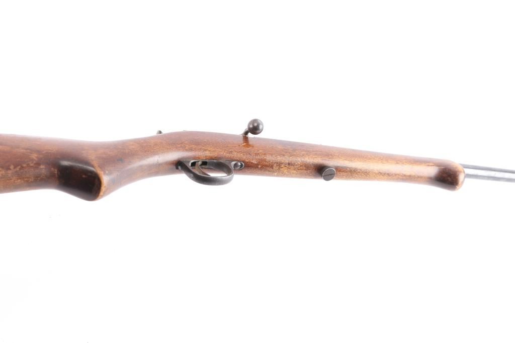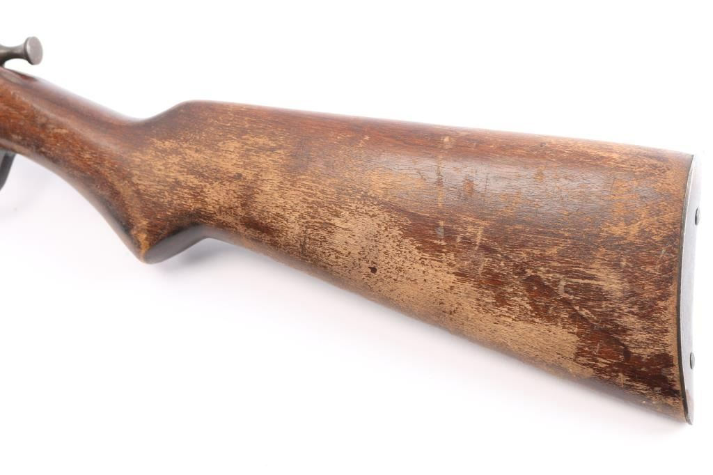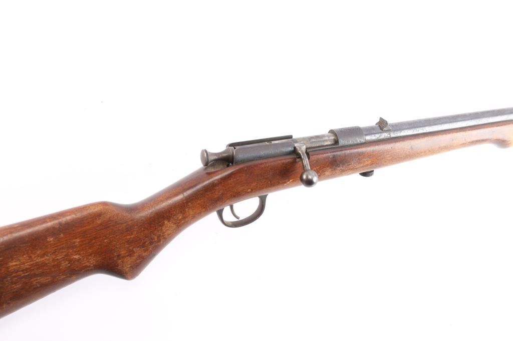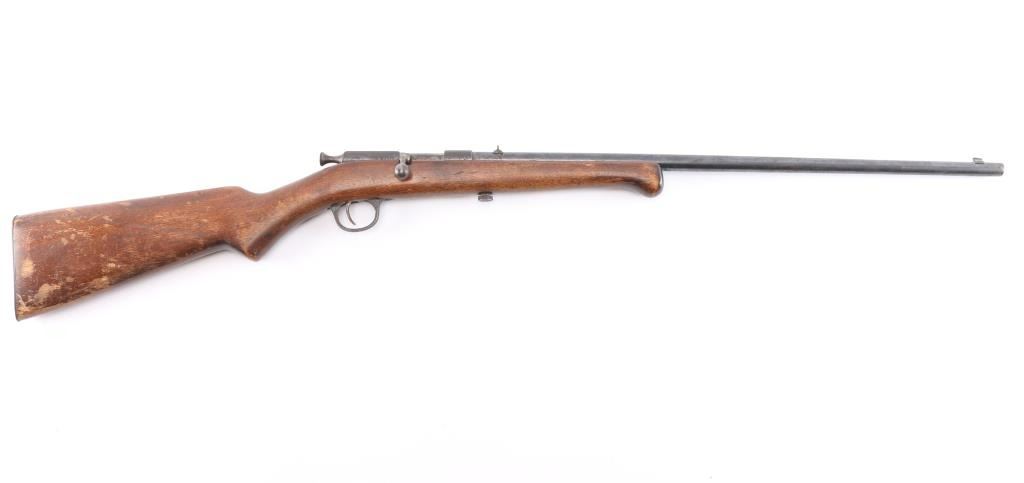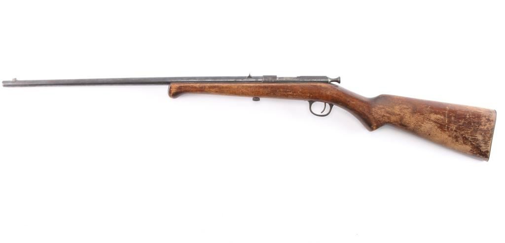 'Self Cocking Safety Rifle'. Early model. Unique action, features an "auto safety" on the bolt that deploys when cocked. The cocking mechanism turns up. When the user is ready to fire, it is pushed down to the center. Blued, bolt-action, single-shot rifle with a 22" barrel, fixed sights, wood stock with steel buttplate. Produced 1928–1941. Dull bluing has scattered surface rust/pitting. Action works well and the bore is very good/bright, the wood stock is sound with much handling wear/finish loss. Great starter rifle, should improve with cleaning.