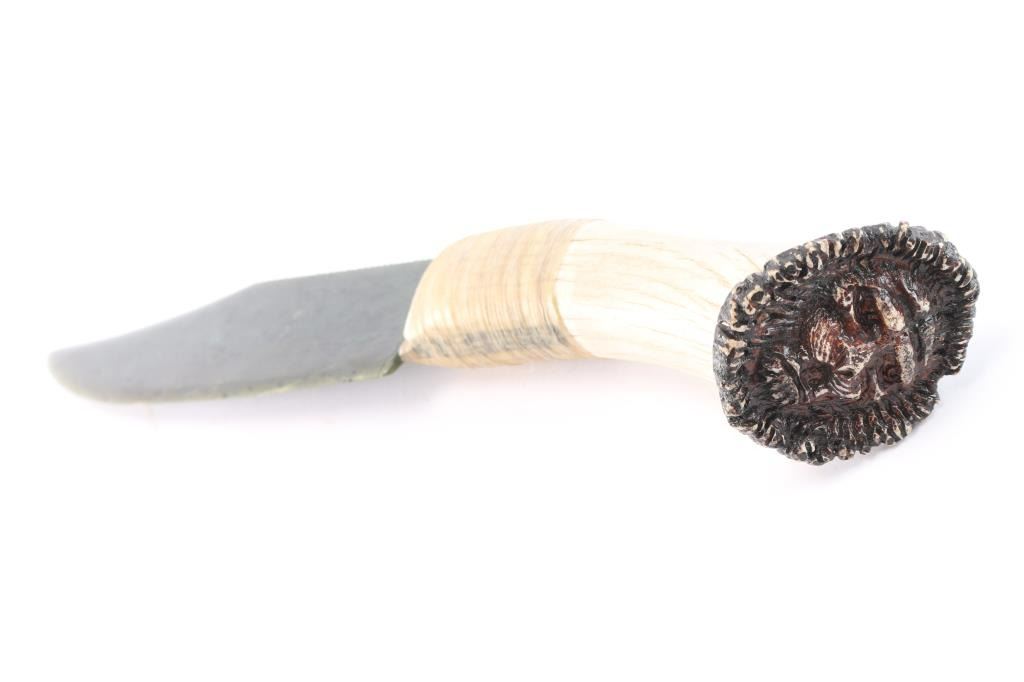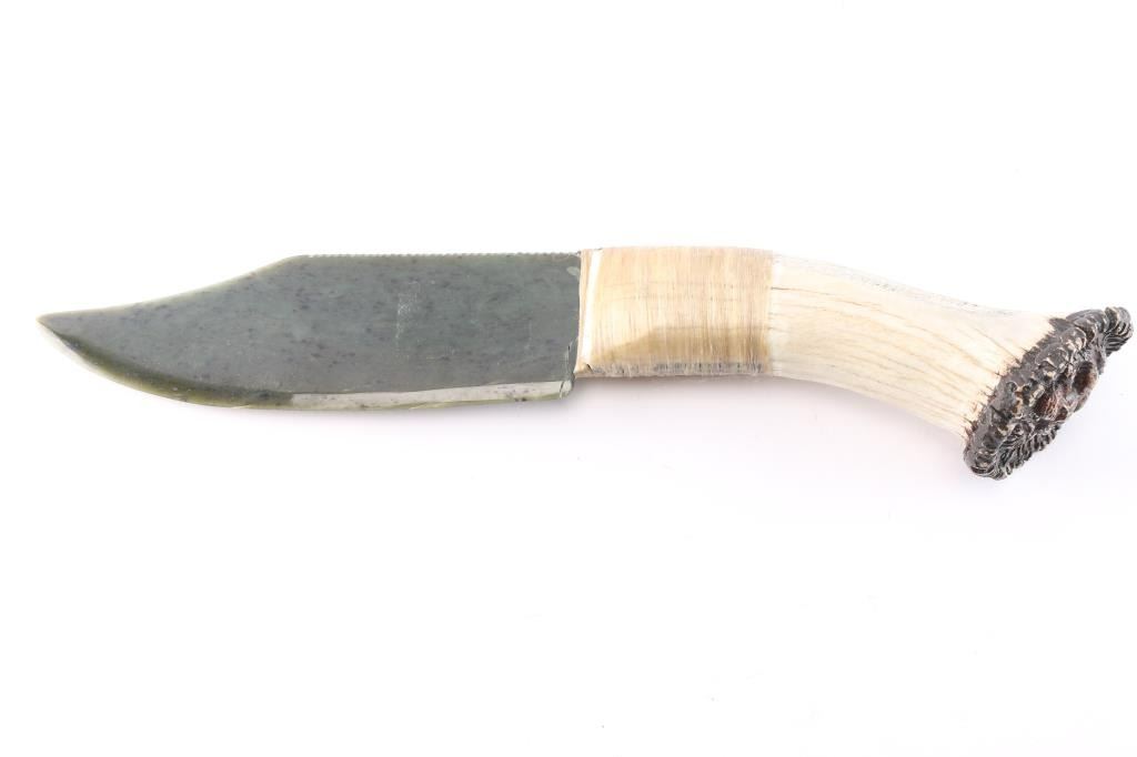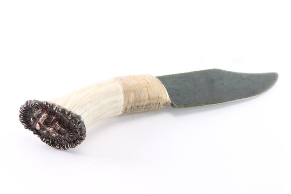 Large dark green jade blade measuring 7 1/4" long and 2 1/4" wide. The elkhorn handle measures 6 3/4" with lion face carving at butt of handle, maker marked. Sinew wrapping at knife hilt.