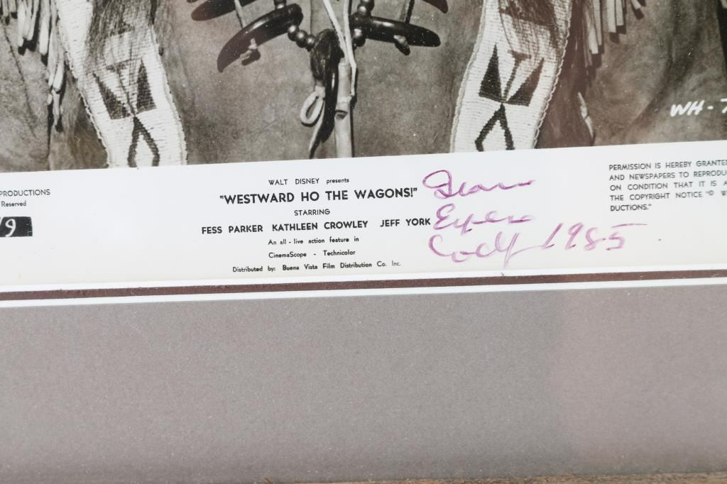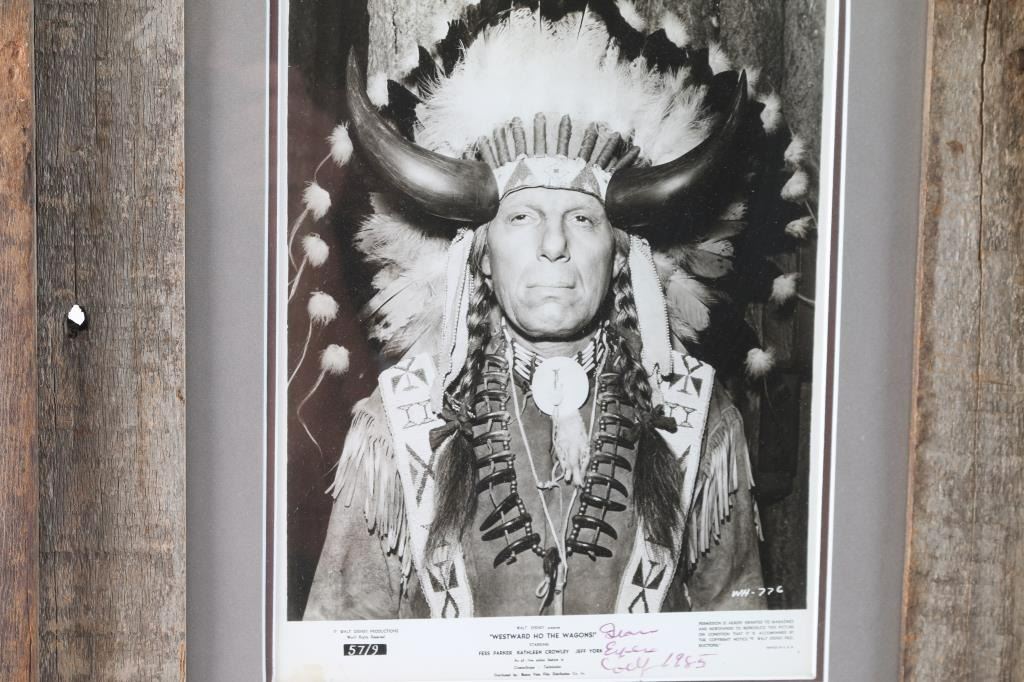 Framed photograph of Iron Eyes Cody from "Westward Ho the Wagons". Measures 19"H x 15"W