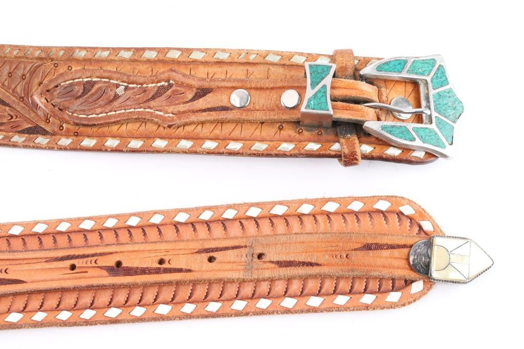 Measuring 41 1/2". One has a belt buckle and keeper inlaid with turquoise and is in slightly worn condition. The other has a tip inlaid with mother of pearl and is in excellent condition.