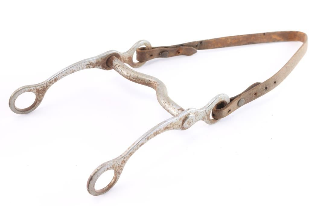 Pair of Mexican silver overlaid spurs with jingle bobs and large rowels. Bit, marked "American" with leather strap. Old and worn leather and rusty metal but a cool look.