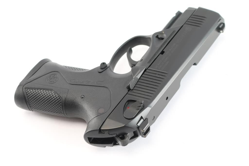 Italian made DA/SA semi-auto pistol chambered for 9x19mm. It features a 3.25" blued barrel with a matte black finished slide, polymer frame with textured grip, ambi safety/decocker, smooth trigger, serrated hammer spur, accessory rail, Dovetailed 3-dot sights. Comes with original hard case, (2) two 12 round magazines, cable lock , and manual. Bore is excellent. Overall finish shows little if any signs of use, wear or handling.