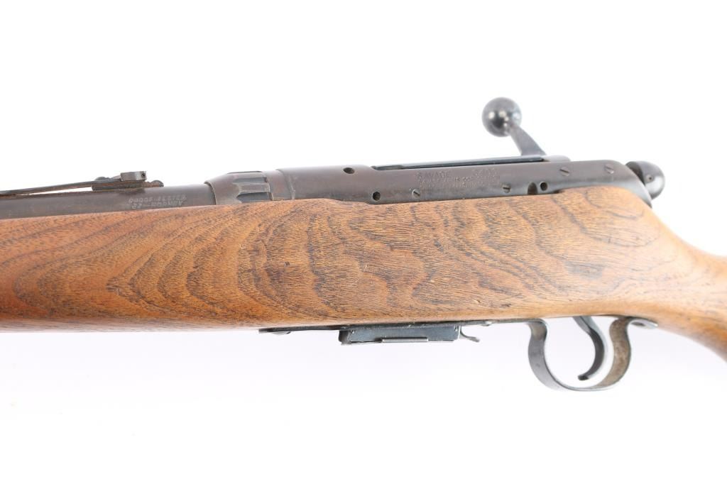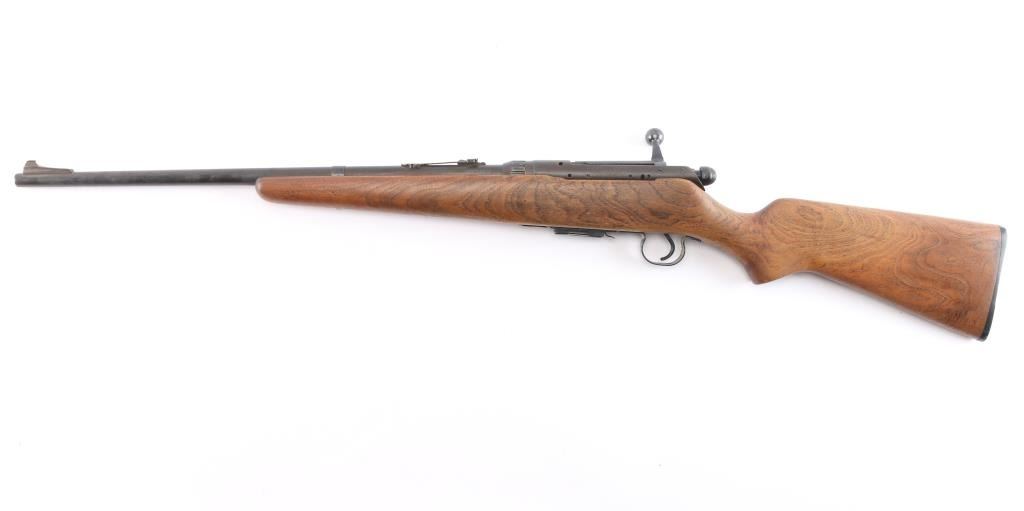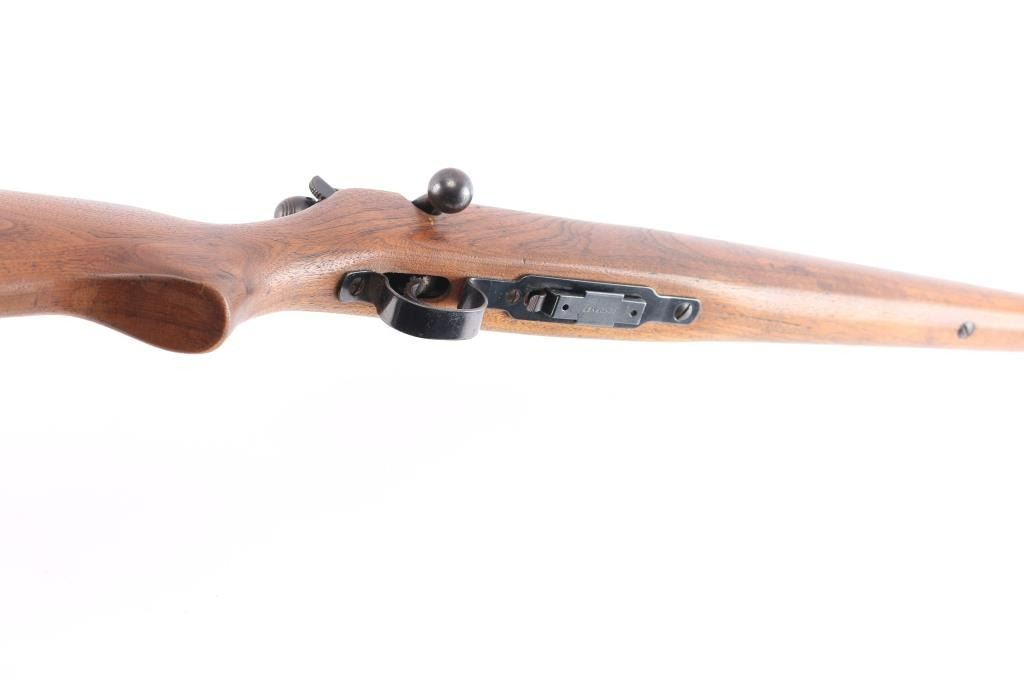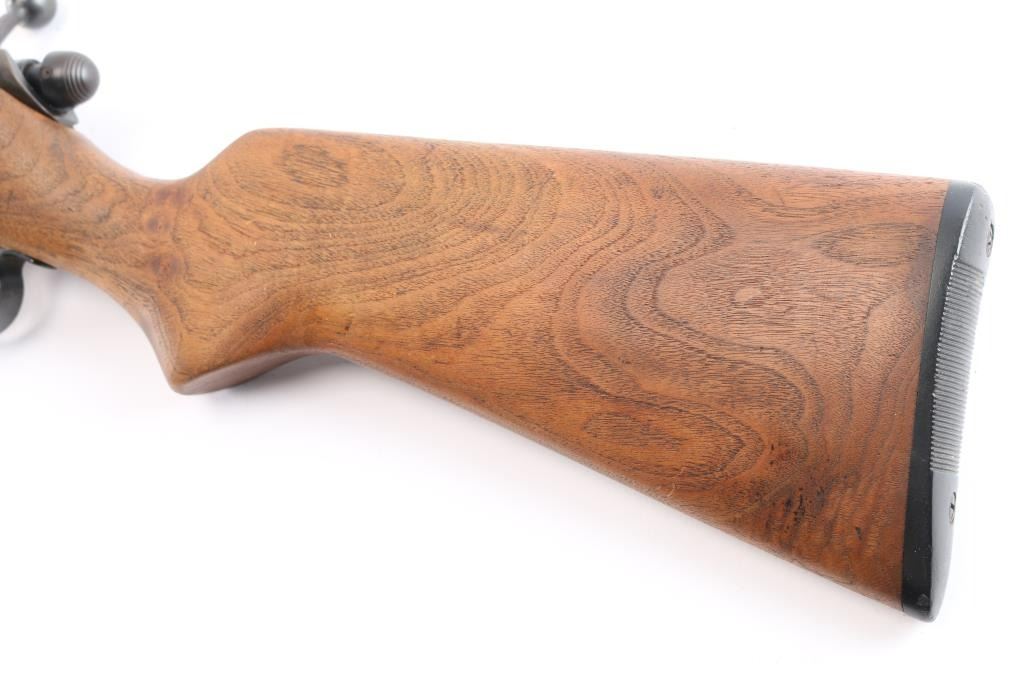 Bolt action rifle. One piece smooth wood stock, black plastic buttplate, 22" barrel, raised blade/bead front, adjustable rear flip sights, manual thumb safety, serrated trigger. Bore is excellent/bright, Action is smooth, 5 rd detachable magazine. Left receiver drilled/tapped for optics. Blue is about 60% with the receiver, lower barrel turning a brown patina from handling, wood is very good/sound with minor scratches/scuffs.