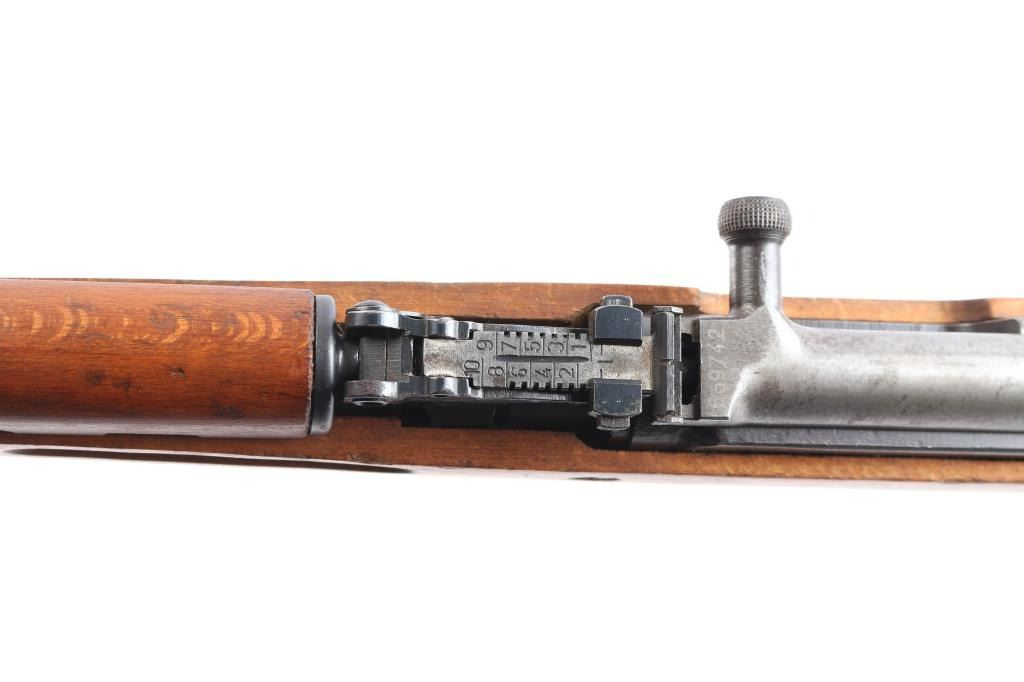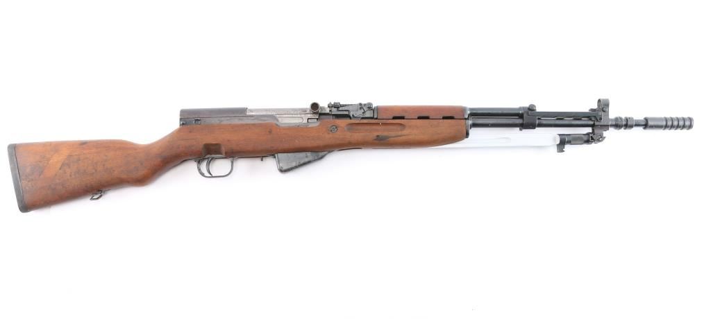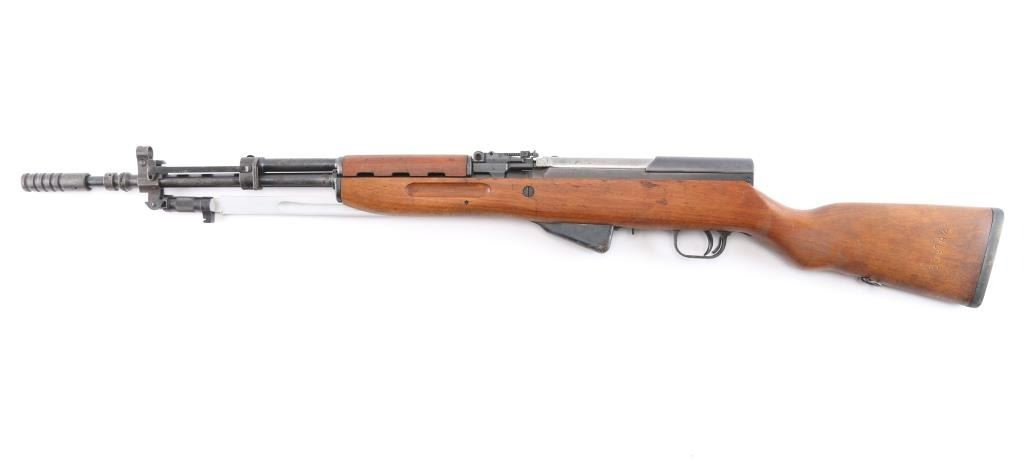 Yugoslavian made semi-automatic SKS pattern rifle chambered in 7.62x39mm, manufactured circa 1967-1989. Imported by C.A.I. of Georgia, V.T. with import marks on the right side of the barrel. Features a blued finish, 20.5" barrel with grenade launcher, hooded post front sight, tangent rear sight graduated to1,000 meters, folding grenade launcher sight, under-folding blade style bayonet, smooth trigger, manual safety, fixed 10 round magazine, smooth wood handguard, and semi-pistol grip shoulder stock with grasping grooves in the forend, black rubber recoil pad. Serial numbers match on the receiver, bolt carrier, bolt, top cover, magazine, triggerguard, and stock. Rifle retains approximately 90% of it's original finish showing light scattered pitting, mostly on the magazine, triggerguard. Action is smooth, the bore is excellent/bright and the wood stocks are very good with scattered blemishes.