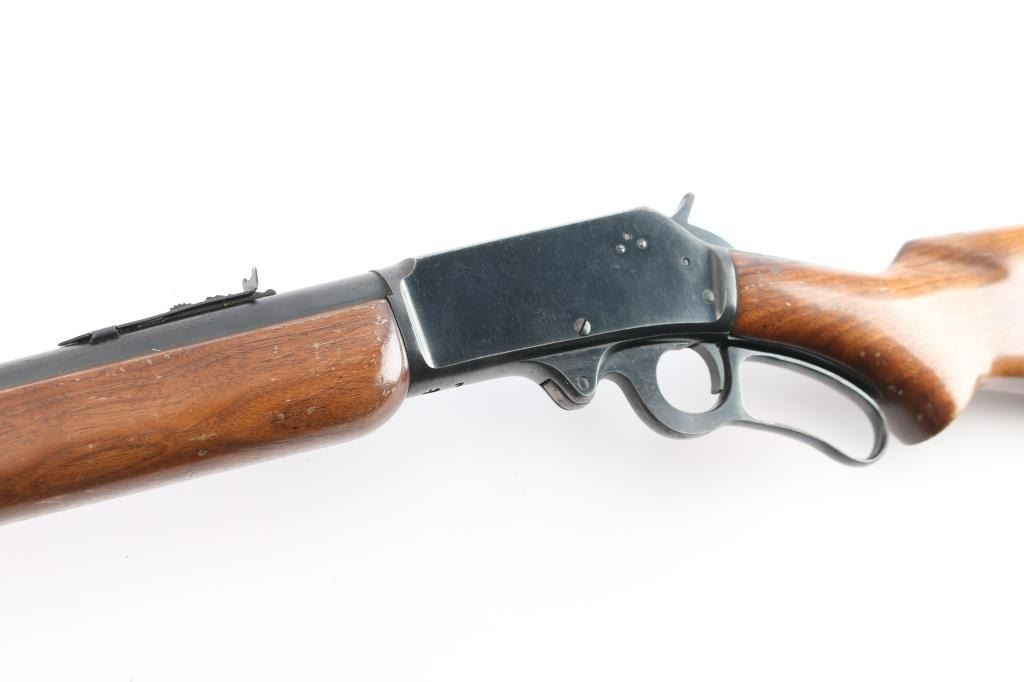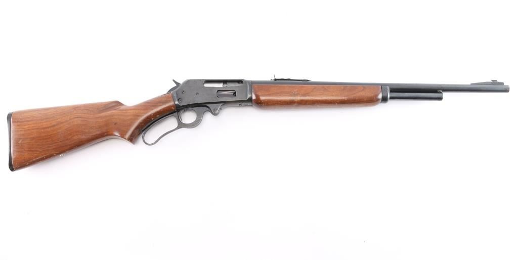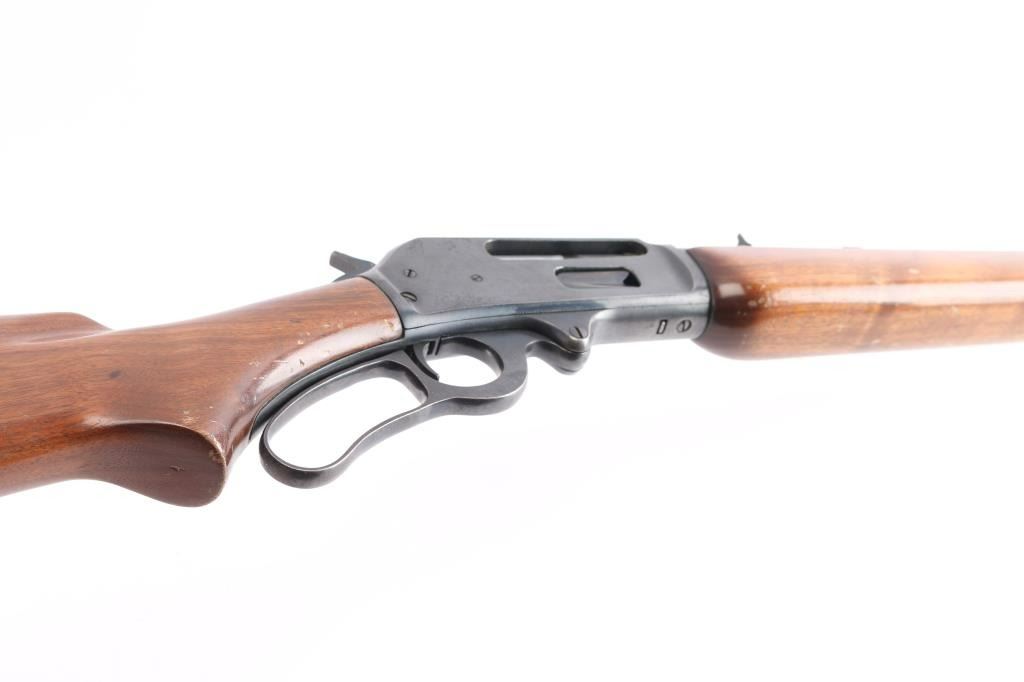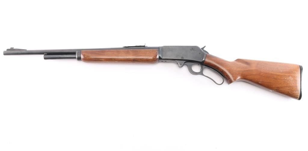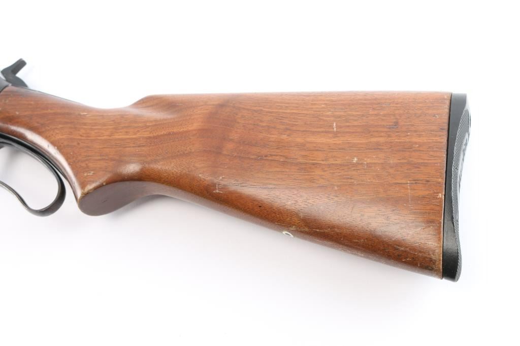 Lever Action 20" Sporting Carbine. Micro-Groove 20" barrel, Rear adjustable sight, brass bead front sight. Manufactured 1949. (First year of production) 7 shot Carbine, American Black Walnut stock & Forearm. Bore is very good/bright, action is crisp/tight, wood is overall good with many minor scratches and small chips to the finish, original blue is about 90% with handling edge/wear, minor scratches.