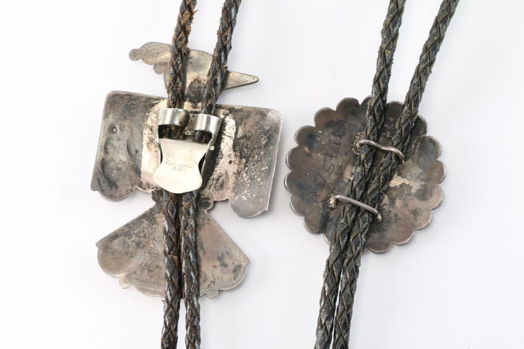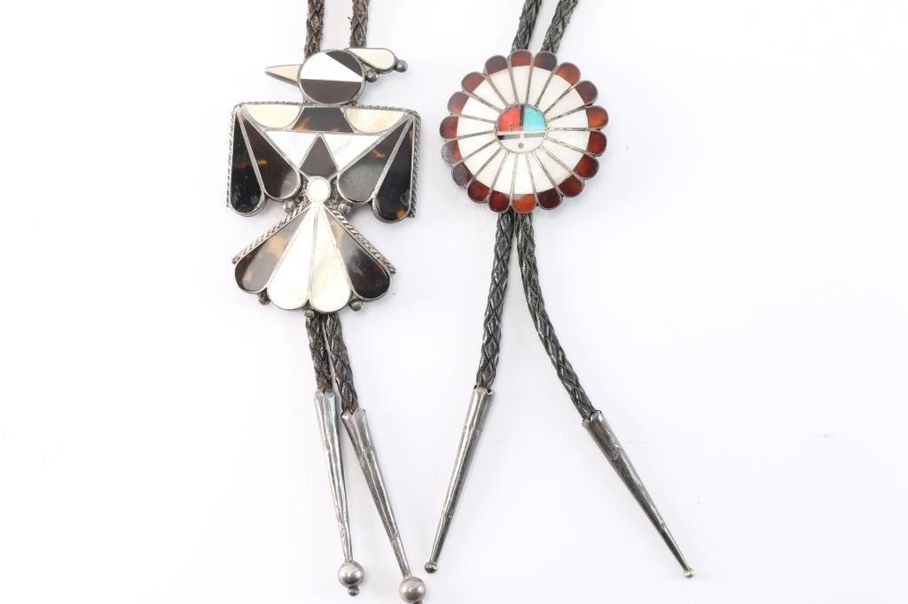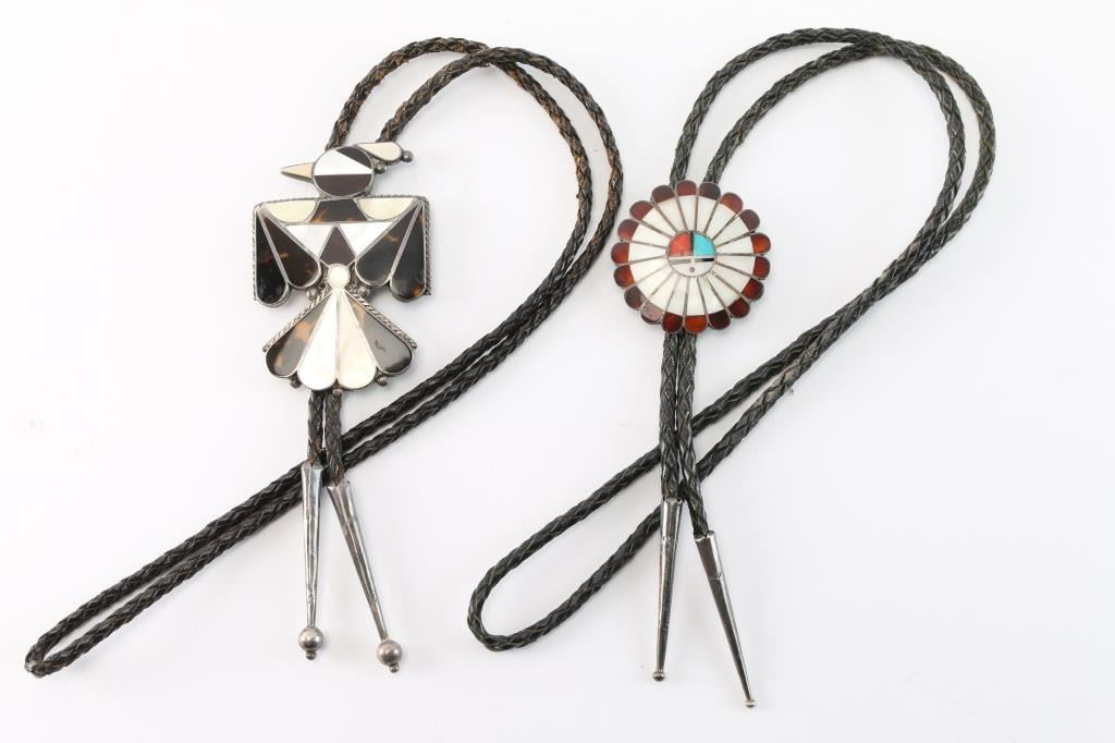One is a sterling silver thunderbird design inlaid with golden and white mother of pearl and brown shell. Has a black leather cord with sterling silver aiglets. Measures 19" total, thunderbird measures 3". The other is a sterling silver Zuni sunface bolo inlaid with mother of pearl, turquoise, coral and brown shell, with sterling silver aiglets. Measures 19" total and sunface measures 1 3/4".