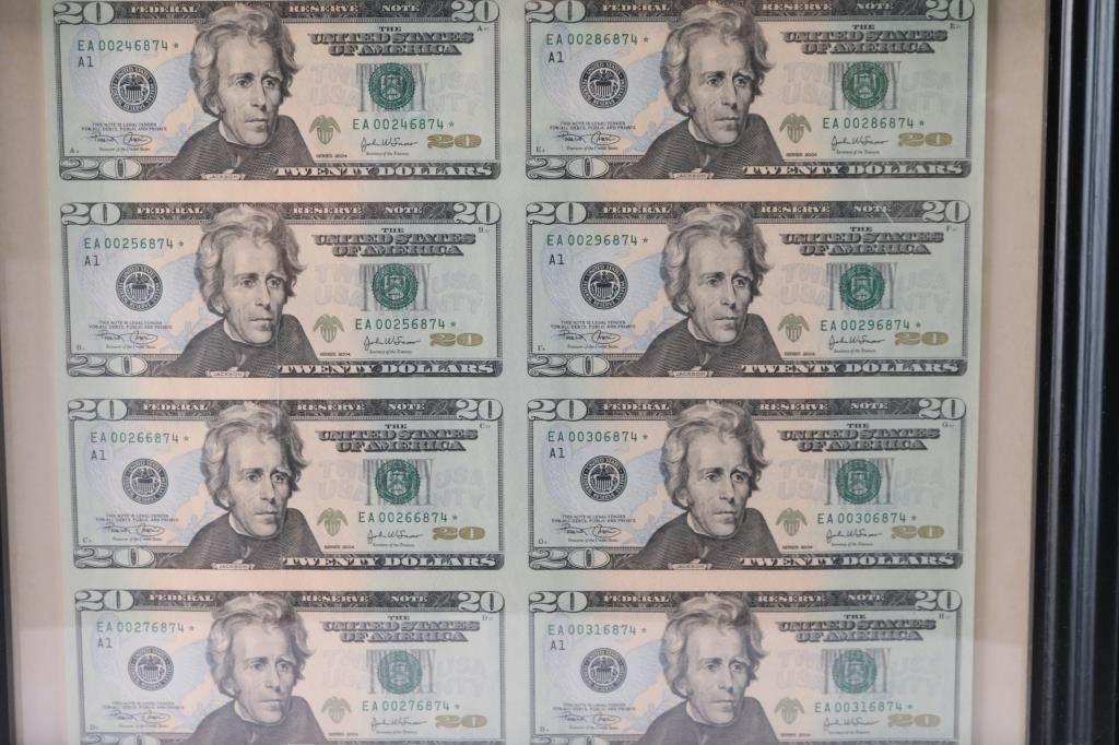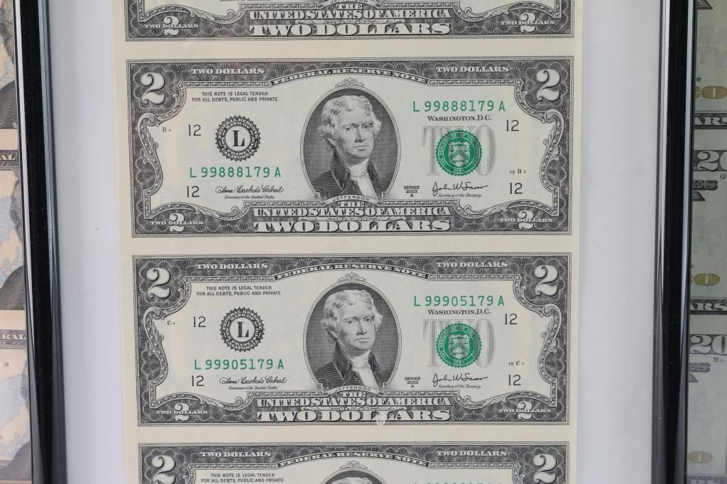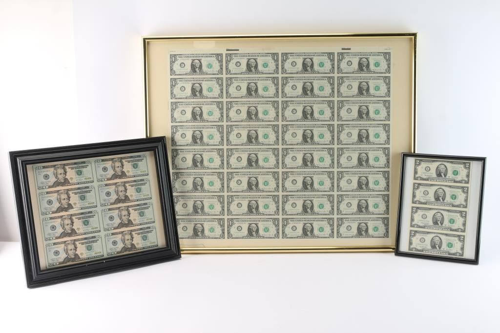 Includes: (1) sheet of 4 $2 bills dated 2004. (1) sheet of 8 $20 bills dated 2004. (1) sheet of 32 $1 bills dated 1981.