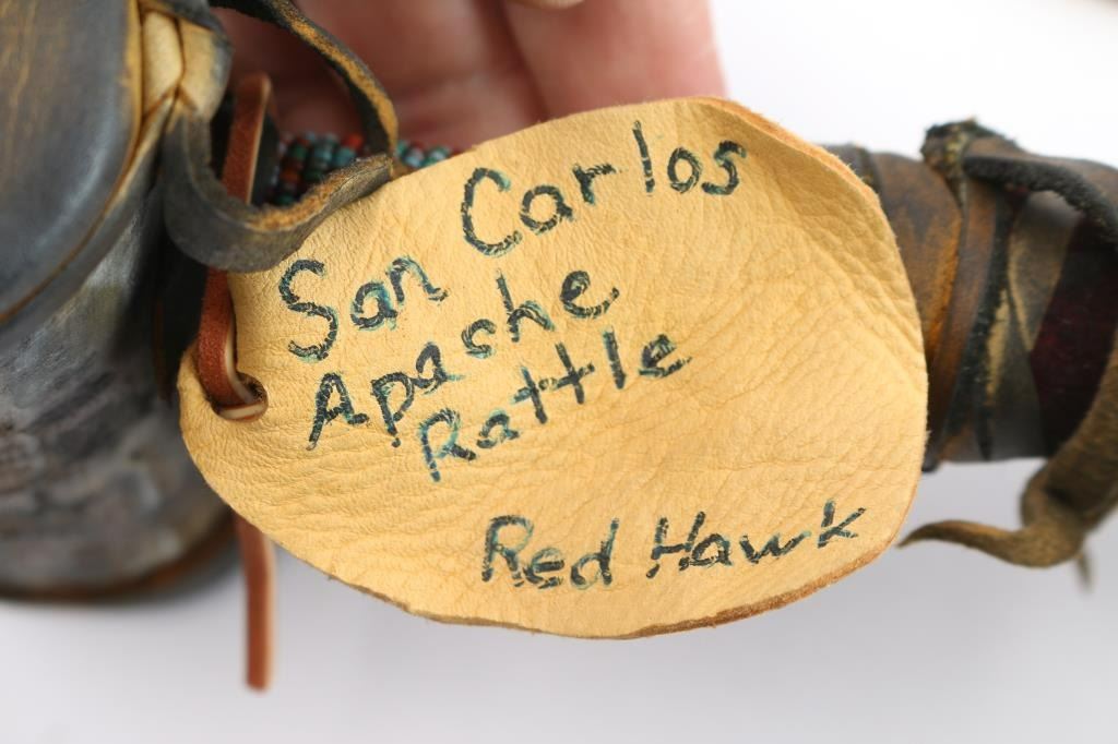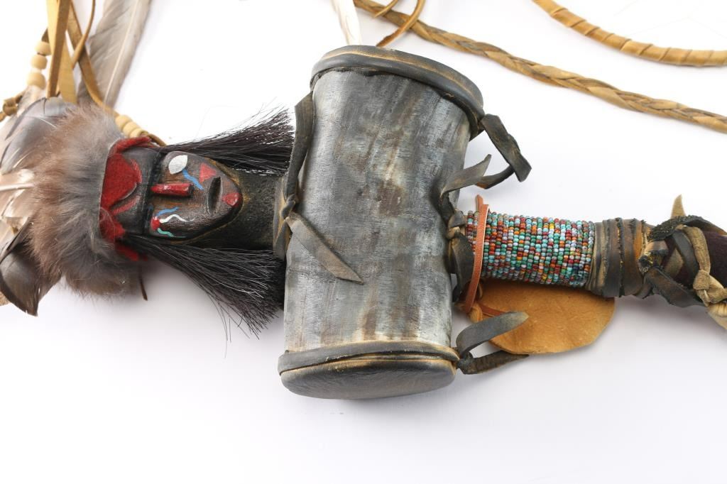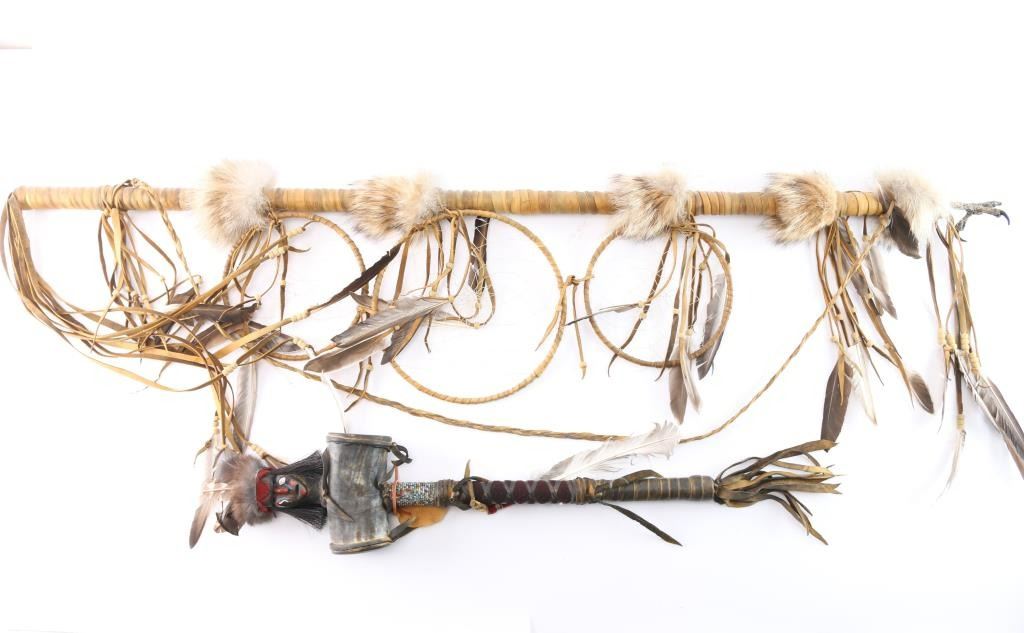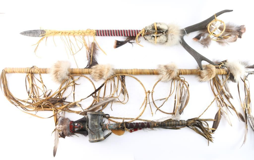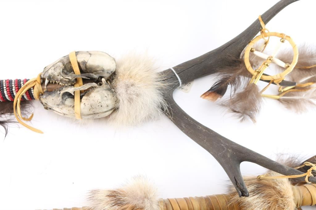 Includes: (1) Leather and beaded (red, white, black) wrapped staff with metal spear point, antlers and skulls. (1) ceremonial hammer made of horn and leather with stones or beads, leather and bead wrapped handle with carved head with feather headdress. (1) ceremonial staff wrapped in leather with fur, 3 dream catchers, feathers and bird talon at the top.