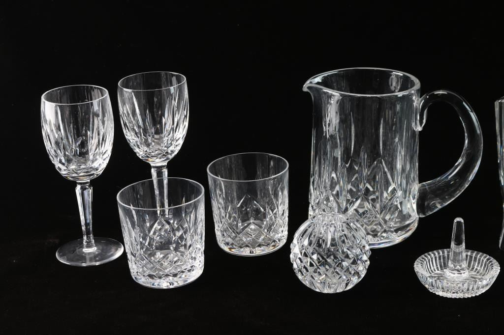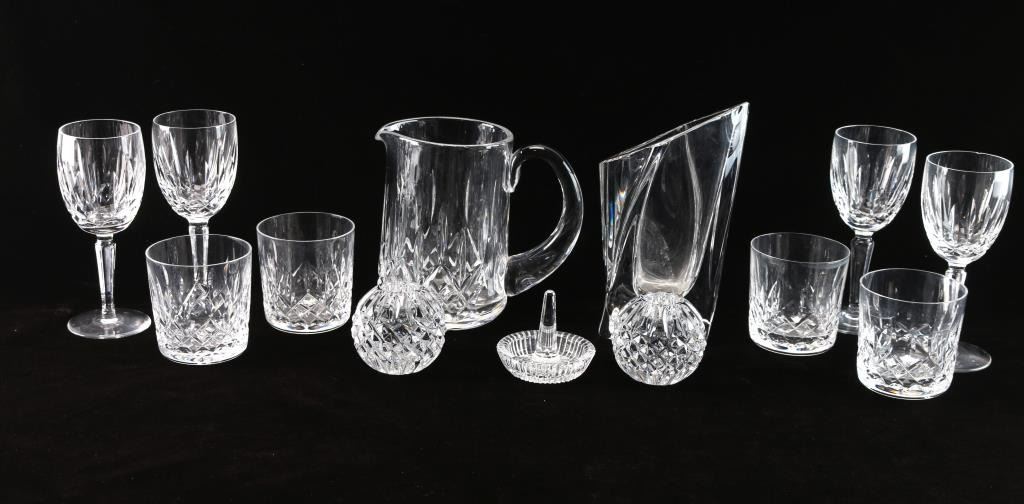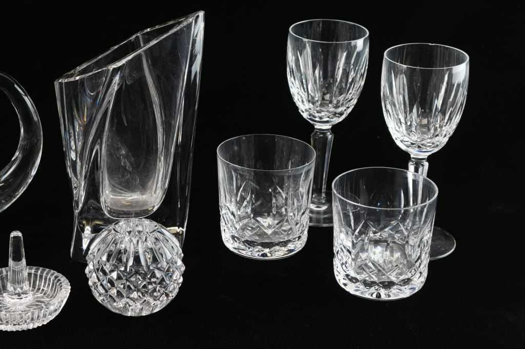 Includes: Small water pitcher, 6" tall, 4 highball glasses, 4 wine glasses, 2 candle holders, a ring holder, and a modern vase, 8" tall.