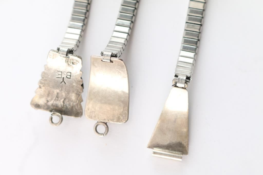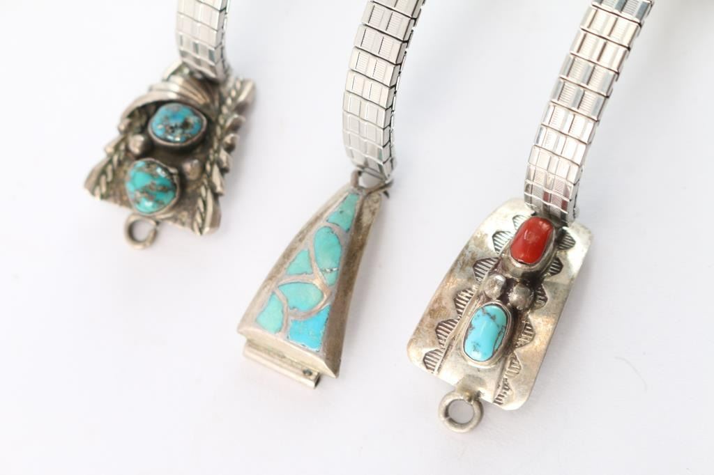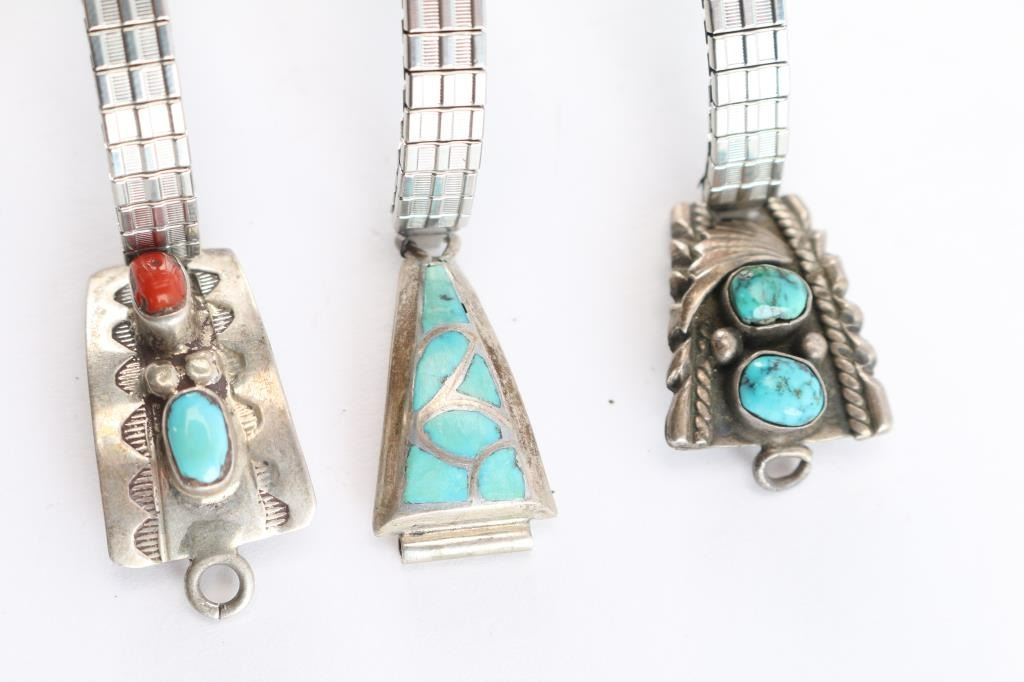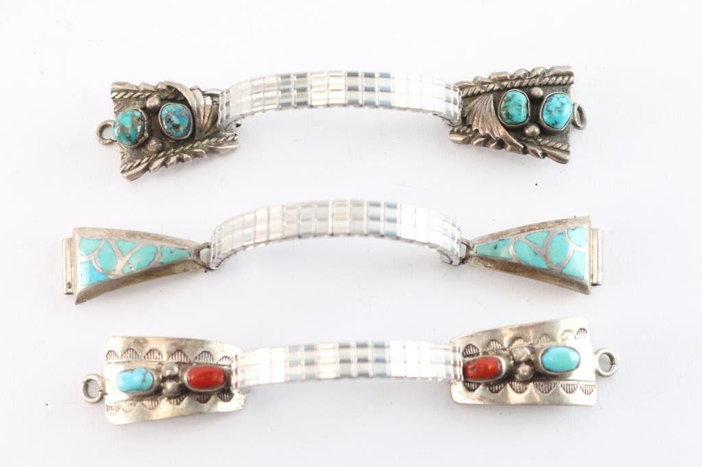 Native American, measuring approximately 5" each. One has inlaid turquoise design; one has a total of 4 turquoise stones and nice etched design, maker marked; and one has turquoise and coral stones.