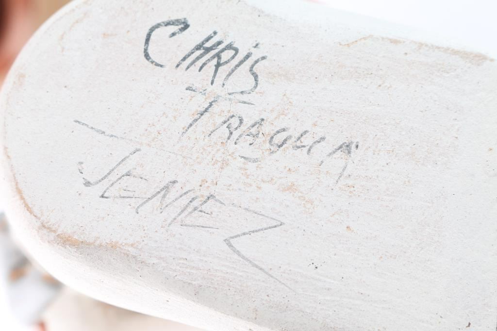 Includes a storyteller signed Chris Tragua, Jemenez, measuring 6 3/4" tall and 5 1/2" long and 3 3/4" at widest. Also includes a small redware pot signed Rose Broncho, San Juan Pueblo, measuring 3" tall by 4" wide. Also includes a clay pottery vase measuring 46" tall by 4 1/2" wide.