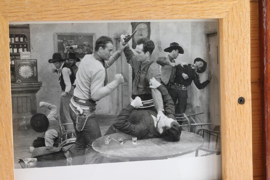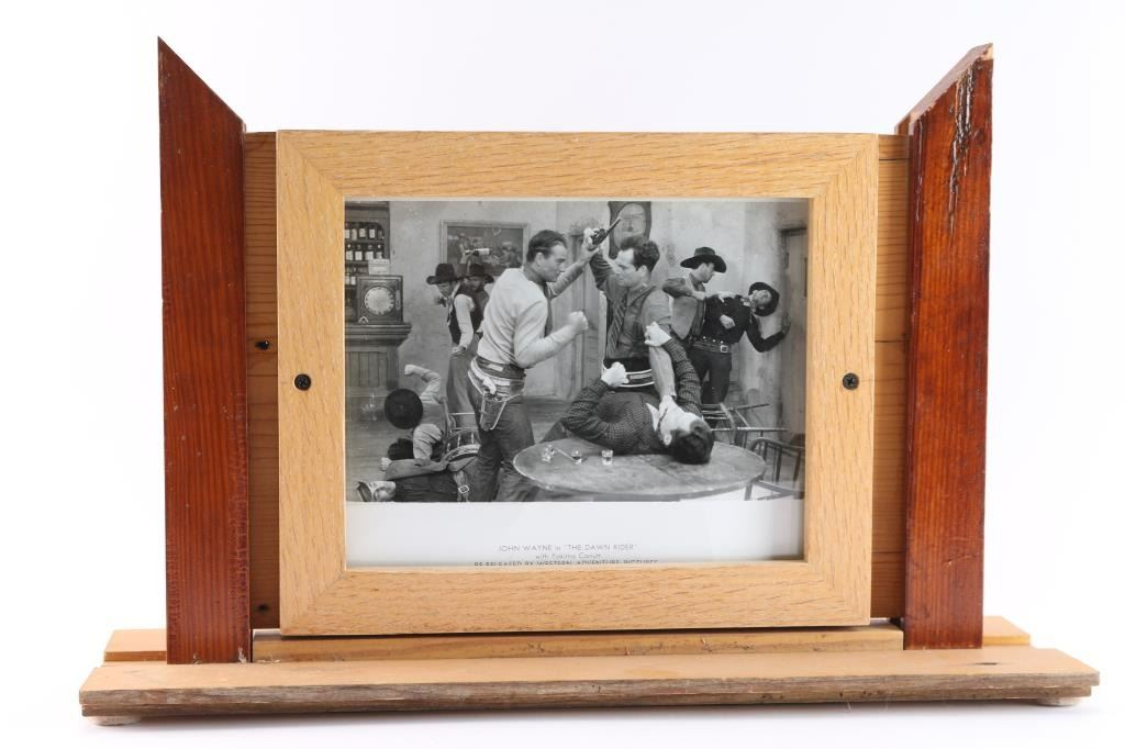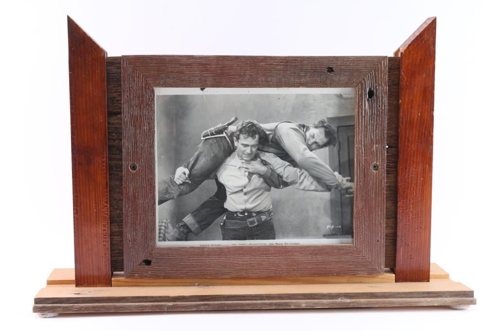 From "Wyoming Outlaw" featuring John Wayne, Ray Corrigan and Raymond Hatton (aka The Three Mesquiteers), released by Republic Pictures; and from "The Dawn Rider", featuring John Wayne and Yakima Canutt, released by Western Adventure Pictures. In hand-made double-sided, double-paned wood picture frame, measuring 13 1/2" tall by 20" wide by 7 1/4" deep.