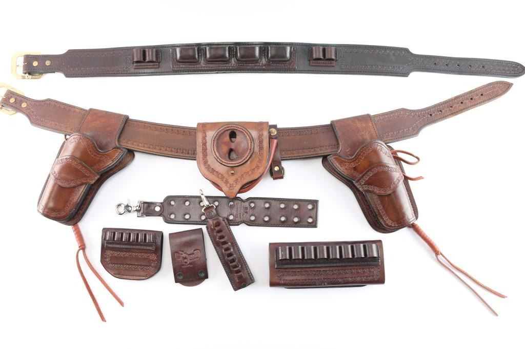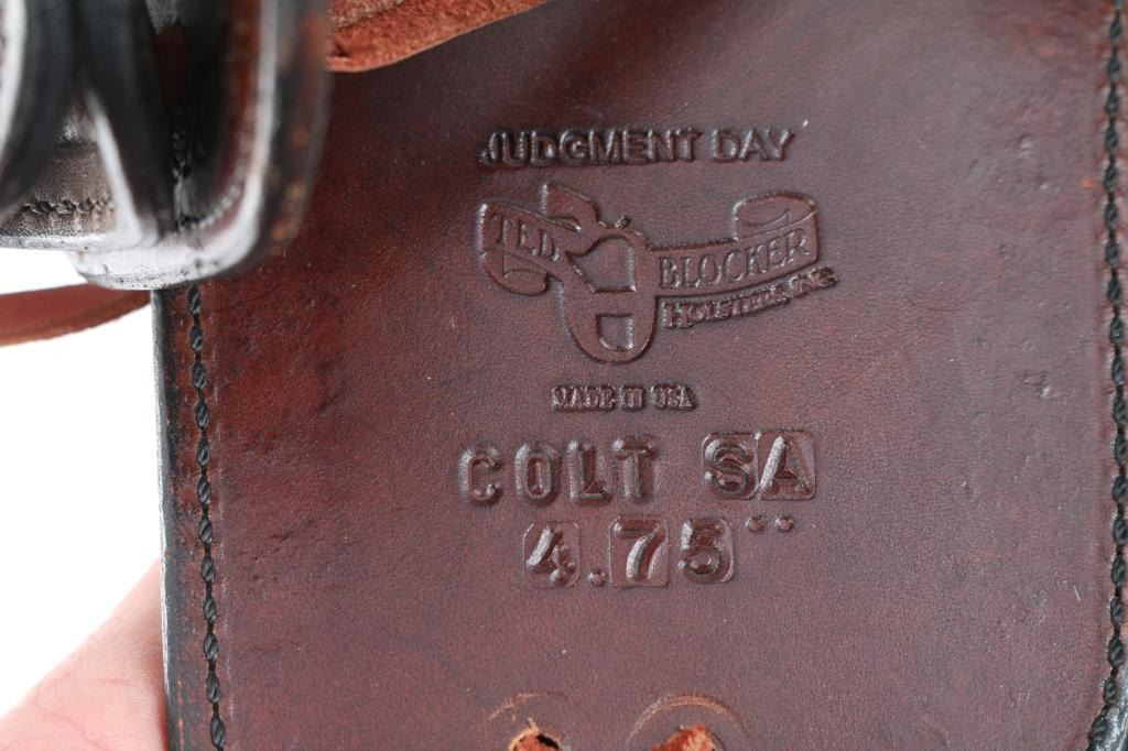 Includes holster rig with two holsters for a Colt S.A.A. 4.75". Judgment Day model, size 38. Includes handcuff holster on rig. Also included are three leather cartridge holders. And a Ted Blocker leather belt with mag holders. Size 37.