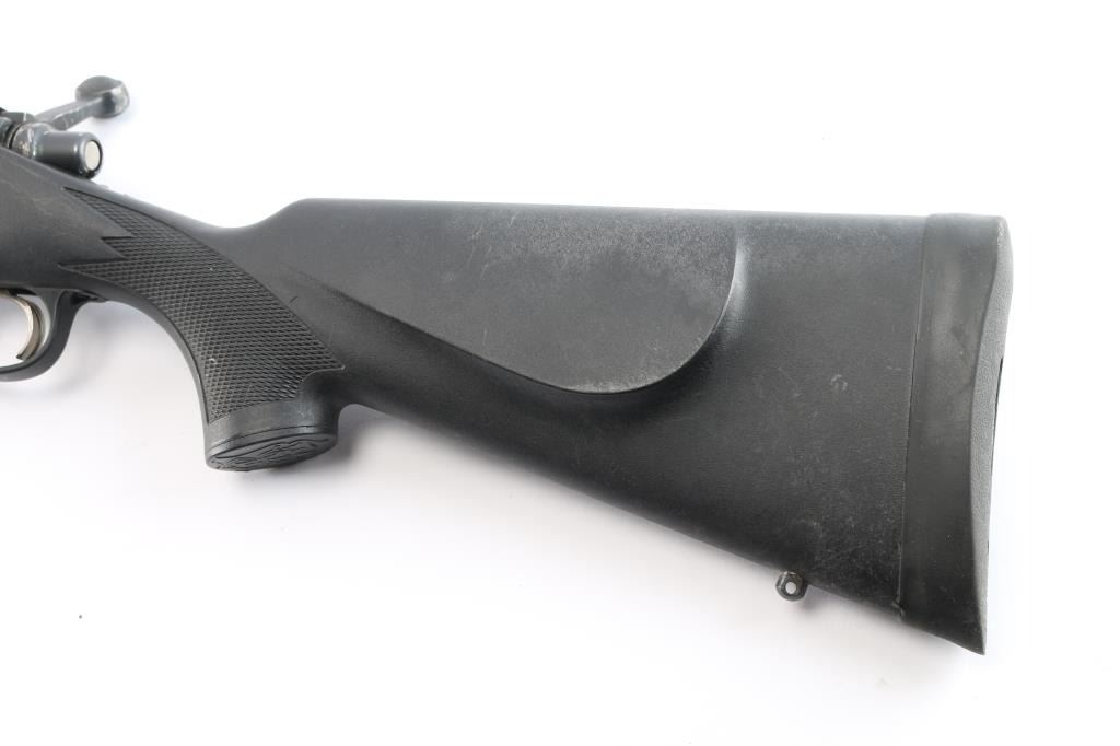 Bolt action, single-shot percussion rifle. 99% matte-black finish, with one piece , checkered, black synthetic stock, factory rubber recoil pad, sling swivel studs, manual thumb safety. 24" barrel, with adjustable rear sight, blade/bead front. Action is smooth/tight. Bore is excellent/bright. Metal ramrod.