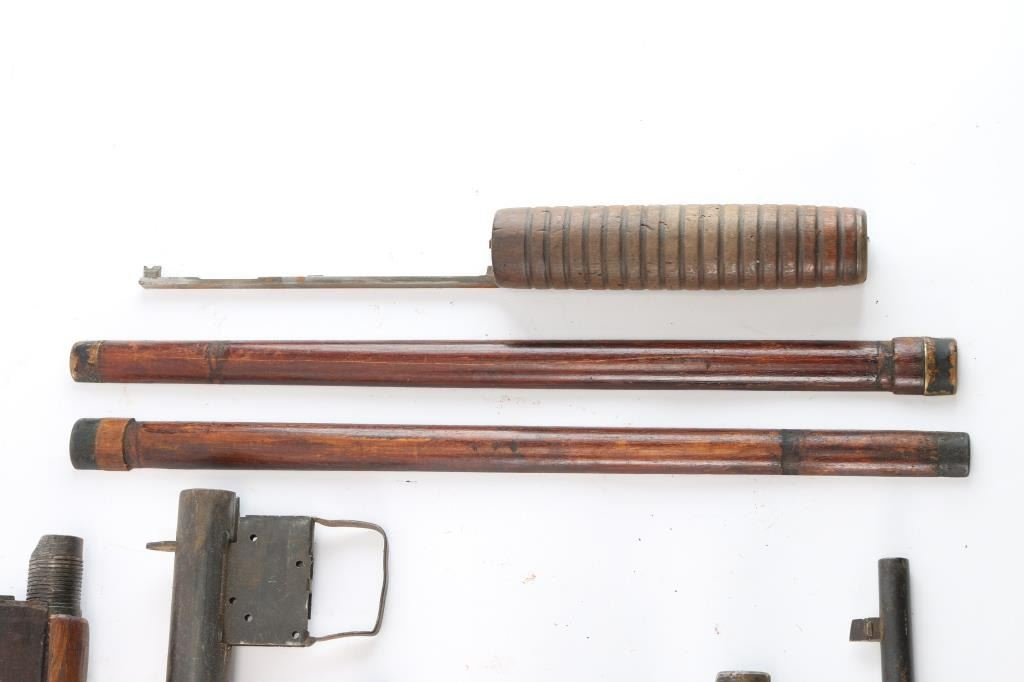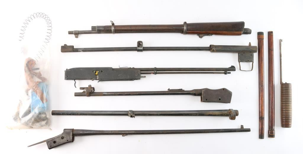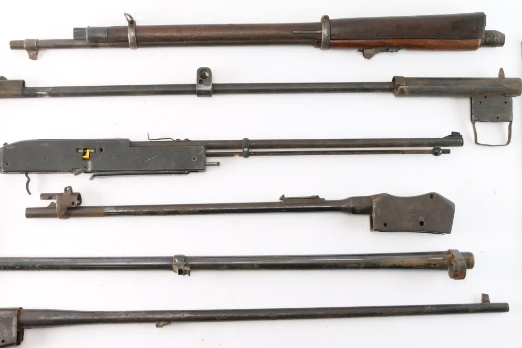 Includes: 1 - 21" Martini-Enfield barreled receiver marked on left side, 'Crown V.R. ENFIELD 1897 M.E. 303 A.C.I. and sold out of service marks with two 'c's, right side marked, 'ENFIELD CROWN ARROW III and 1', top marked 'NOT FOR BALL', barrel marked on left side, 'ENGLAND' 'STERLING' and other markings on bottom, pitting and scattered rust thourghout; 1 - 30" Remington Arms Rolling Block barreled receiver in 7mm marked on tang, 'REMINGTON ARMS COMPANY ILION NY.' w/ patent dates, major rust spots and pitting throughout; 1 - 30" Remington M1901 Rolling Block Military 7mm Spanish Mauser barrel w/wood front and rear handguards, metal bands and bayonet stud, fair to good condition and more parts.