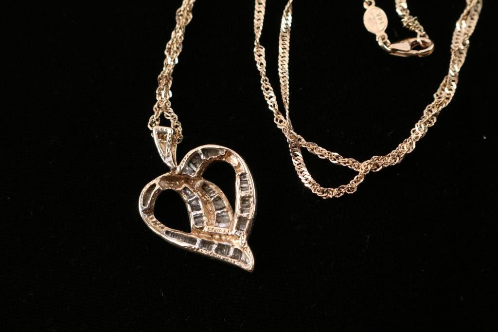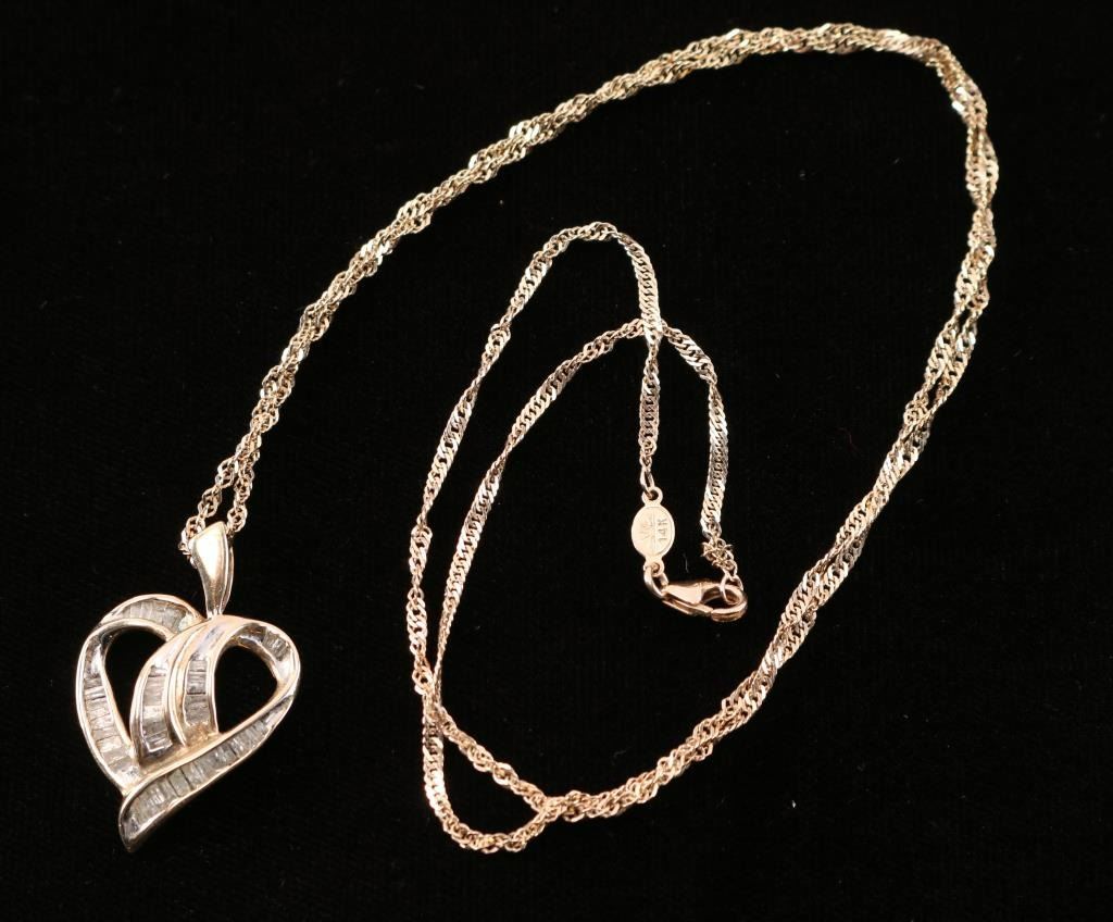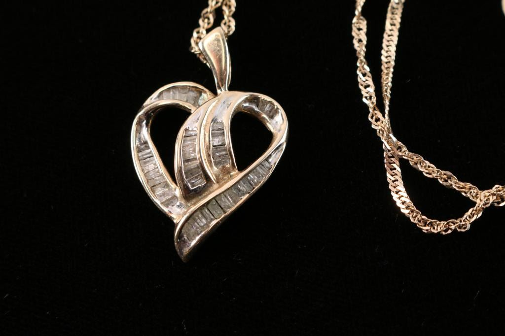 Vintage 10k gold heart pendant with 34 diamond baguettes. Measures 1". On 14k gold chain measuring 11 1/2".