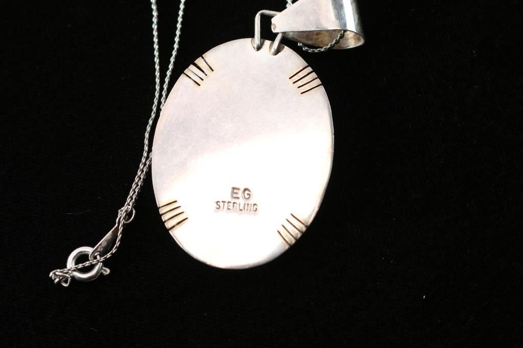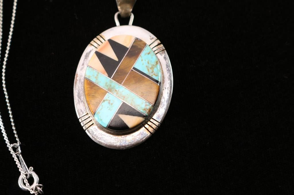 On sterling silver chain. Maker marked E.G. With turquoise, spiny oyster, a black stone and tiger's eye. Pendant measures 2 1/4" and necklace measures 10 1/2" from drop.