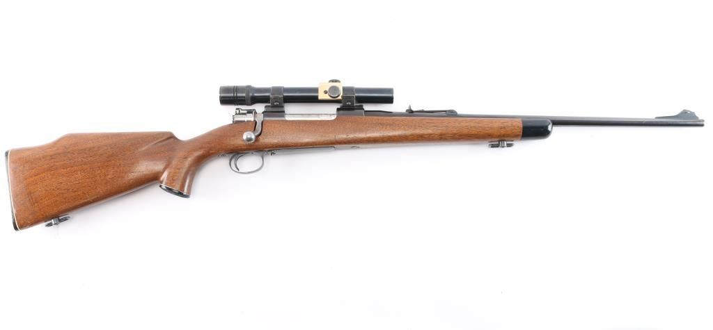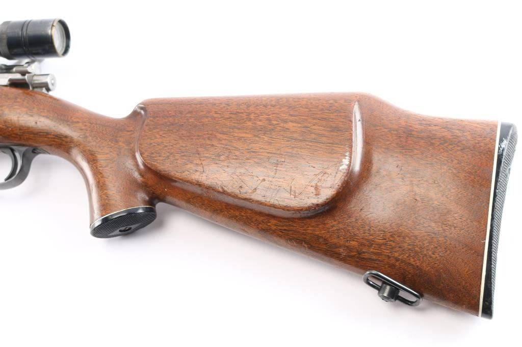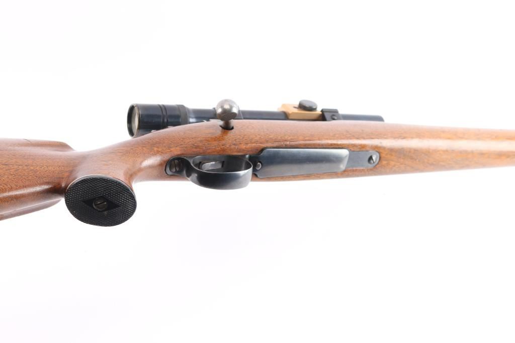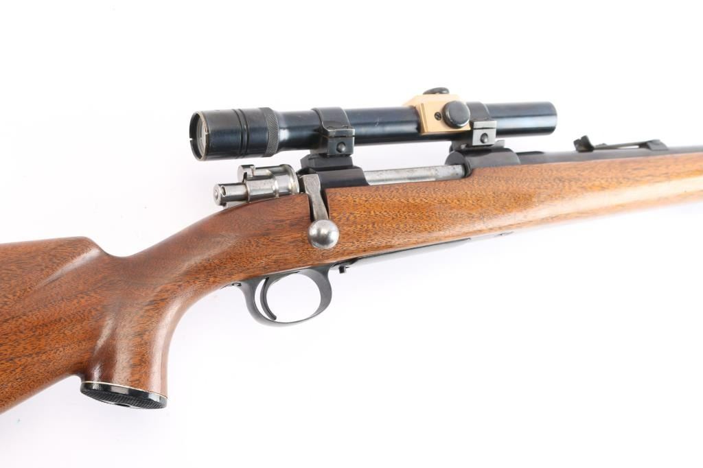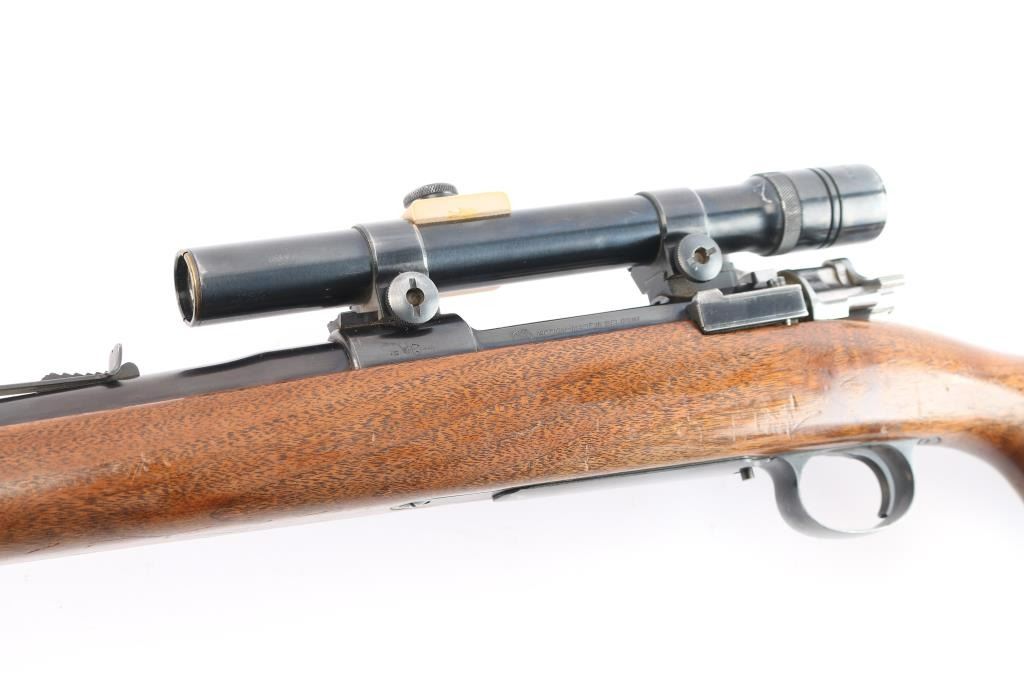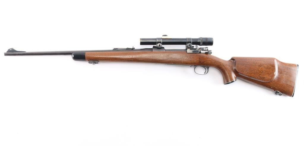 Quality 'Trade Name' bolt action rifle manufactured by FN in Belgium, imported by Sears. Mauser style action. Features blued finish, smooth walnut stock with curved grip,sling swivels, cheek rest. black plastic buttplate and grip cap with white spacers, ebony fore cap, 22" barrel, raised blade front sight, rear sporting sight, hinged floorplate , flat bottom bolt knob with checkering on flat, low swing manual safety on bolt shroud. Installed vintage J.C. Higgins 'Rifleman Senior' 2 1/2X scope, fine crosshair reticle, clear optics. Bore is excellent/bright. Retains 96% finish with wear on receiver, and bolt release. Stock is very good condition with minor scratches. Manufactured approximately 1954 to 1956,