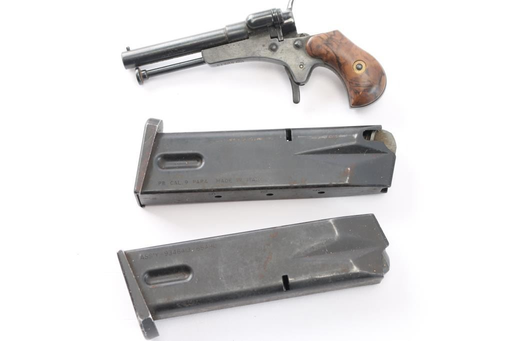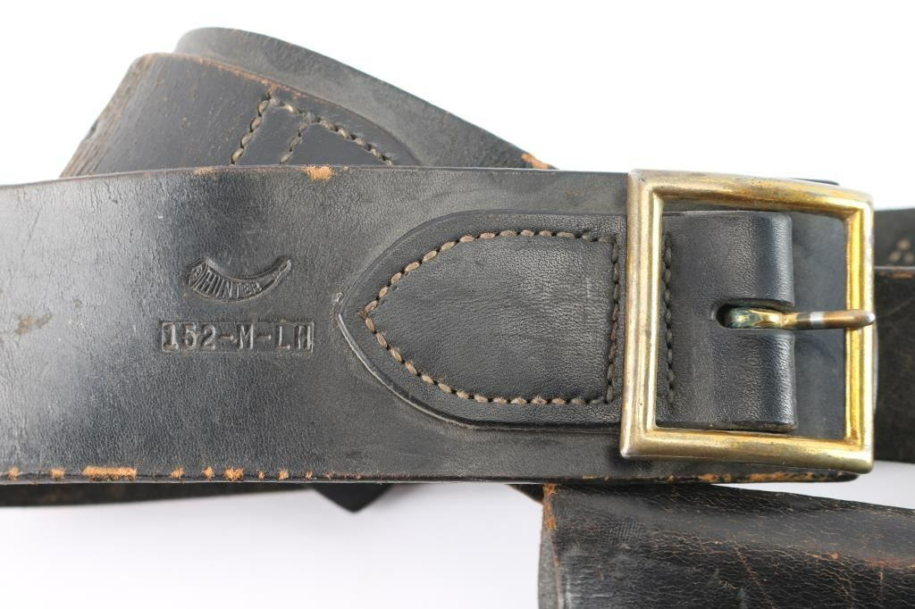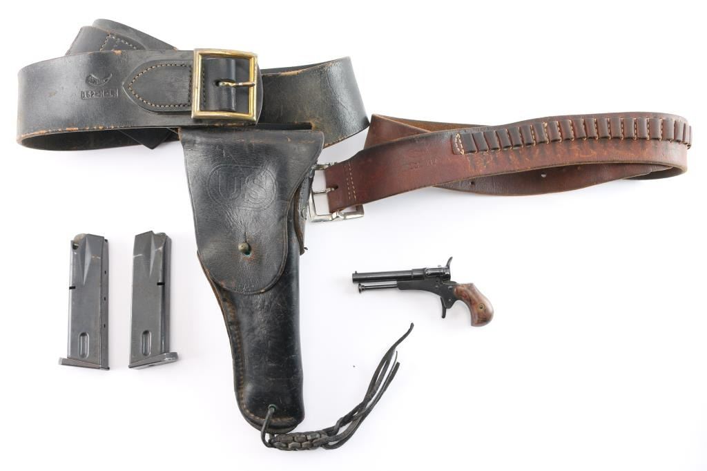 (1) 1911 leather holster with belt (Hunter),152-M-LH. (1) Hunter gun belt, 122 XLG. (1) Pedersoli blank pistol, 4.5mm. (2) Beretta 9mm, 15rd magazines.