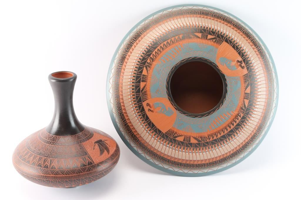 (1) Dine Incised carved pot with bird design 10"x9"