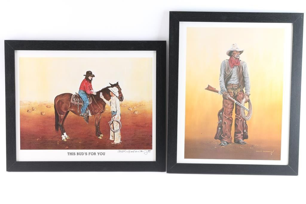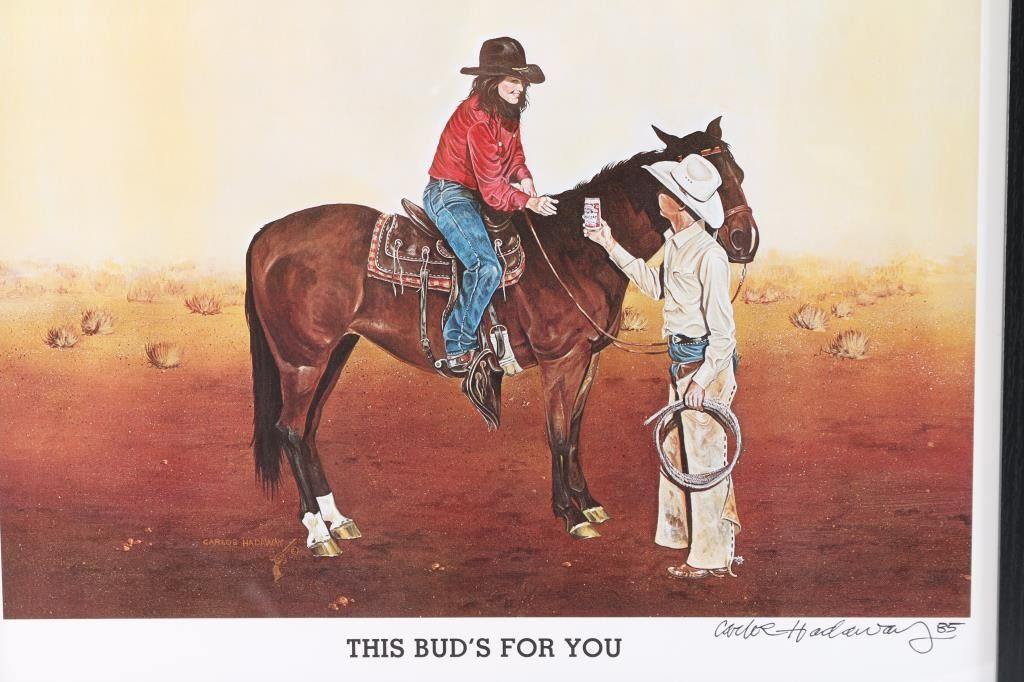 Includes "This Bud's For You", 1981, original signature acquired 1985; and untitled cowboy with rifle and rope, no original signature or date. Both measure 19" x 15", in black wood frame 22" x 18". Carlos Rudolpho Hadaway (1941-2017) was born on August 15, 1941, in Portsmouth, Virginia and was raised in San Diego, California. He was the oldest of six in a family known as “The Wild Bunch.” While still a child, he suffered blindness twice and underwent six eye operations to eventually regain his sight. As a youngster, Hadaway's keen interest in art was encouraged and nurtured by his third-grade teacher, Sister Helen Theresa. In his early teens, when the family spent two years in Sasebo, Japan, his Japanese art teacher exposed him to portraits, sketching, landscapes and the appreciation of nature. As he grew, he never lost his fascination of the Old West and the western lifestyle, so it was natural that his deep-rooted passion was expressed through western art. He once stated, “When I paint the cowboy life, I’m painting my vision of heaven.” His favorite medium was oil on canvas, although in the early years he worked with watercolors and pen and ink.