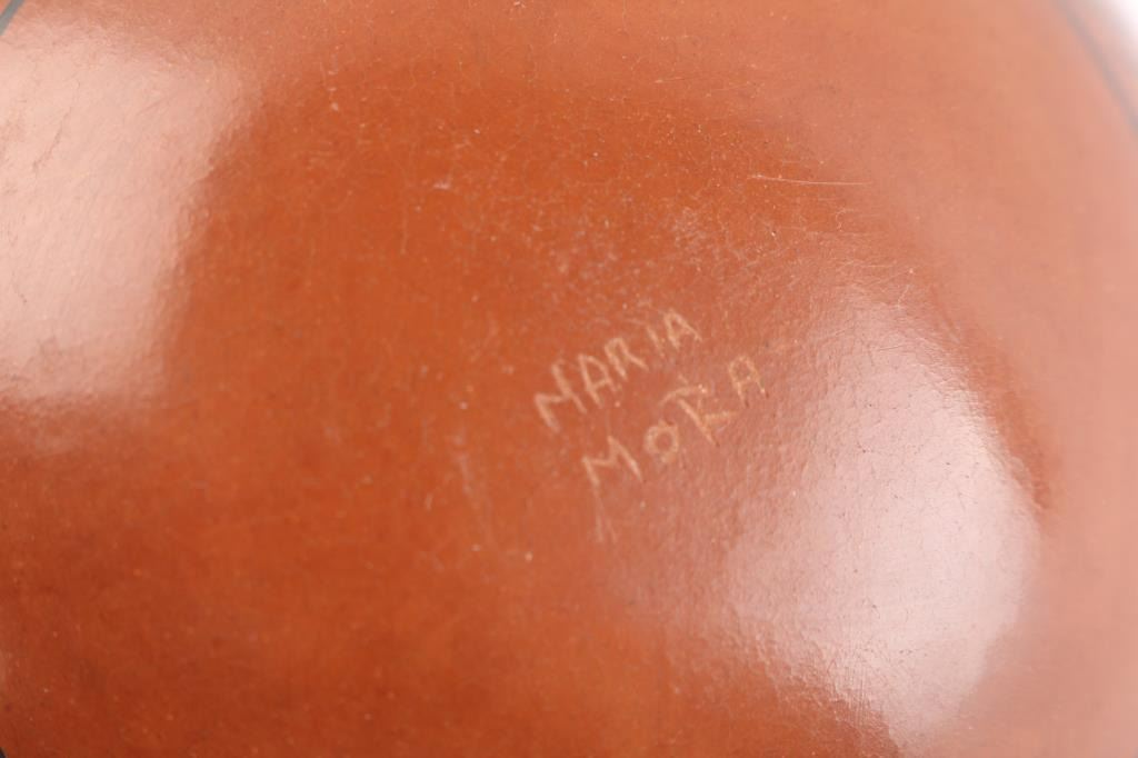 Mexican pot, signed Maria Mora, 4" x 5". Navajo pot, signed TW, 6.5" x 2.25". Navajo pot, signed F. Begay, 3.5" x 3.25"