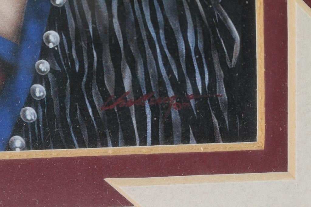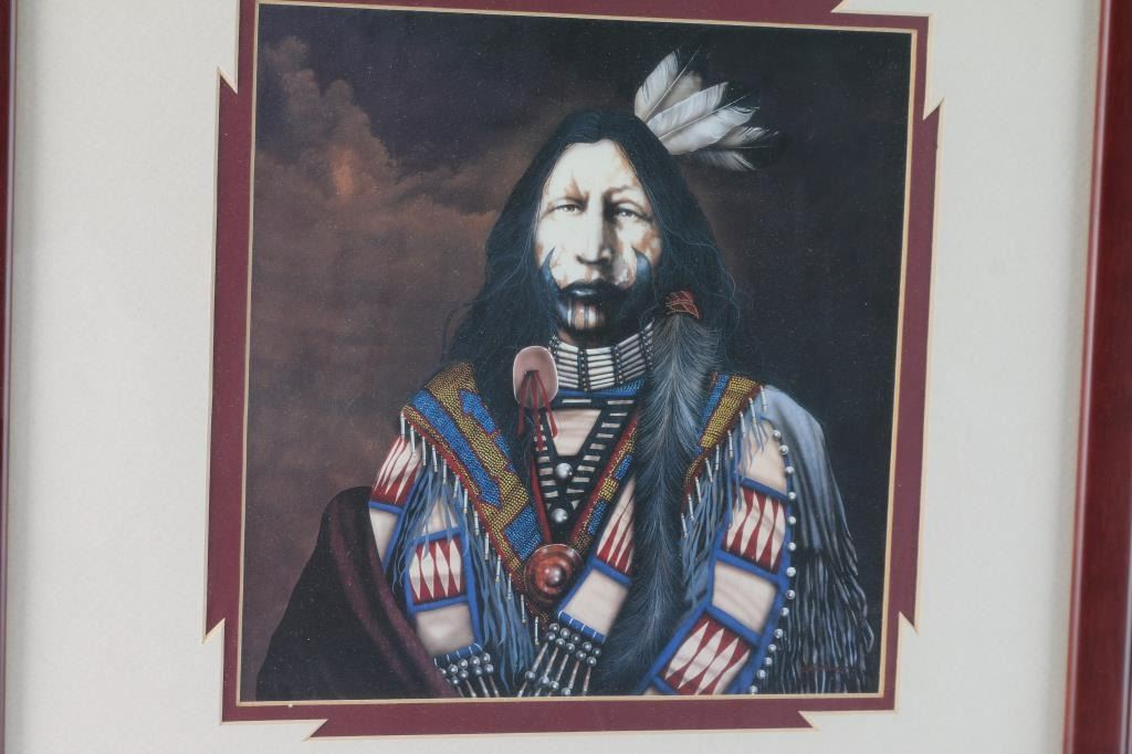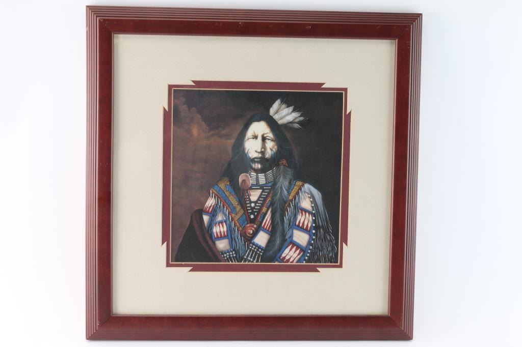 Depicting warrior sitting portrait. Measures 9 1/2" x 9 1/2", matted and framed measures 19" x 18 1/2".