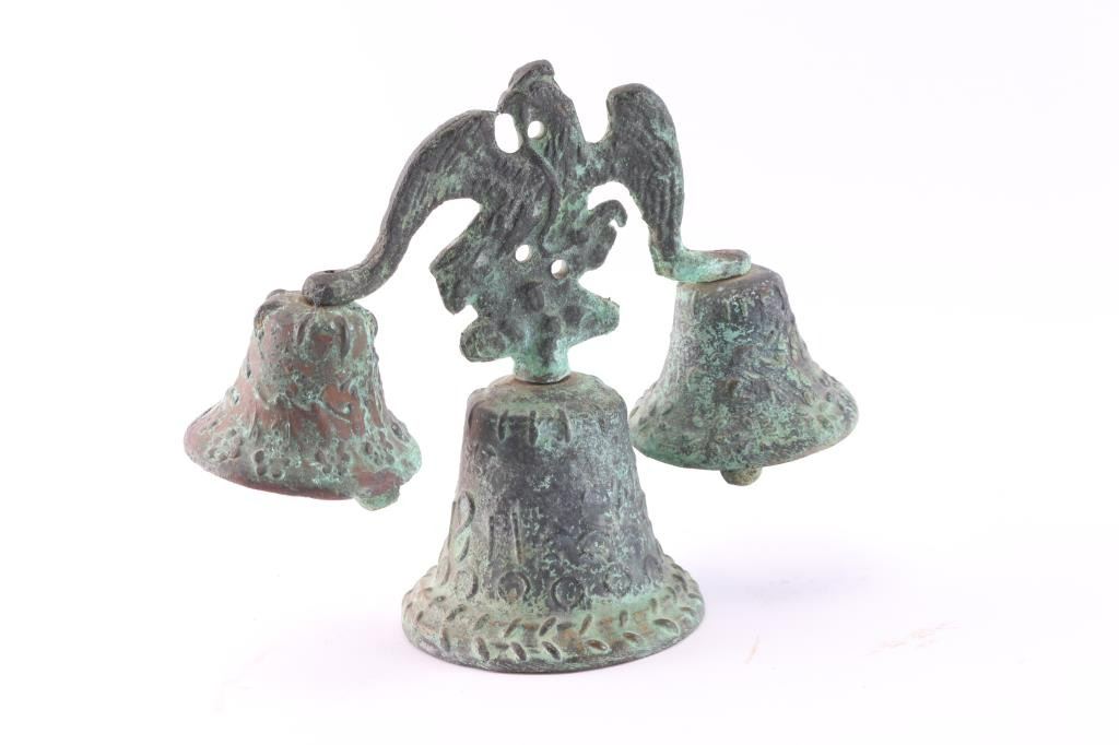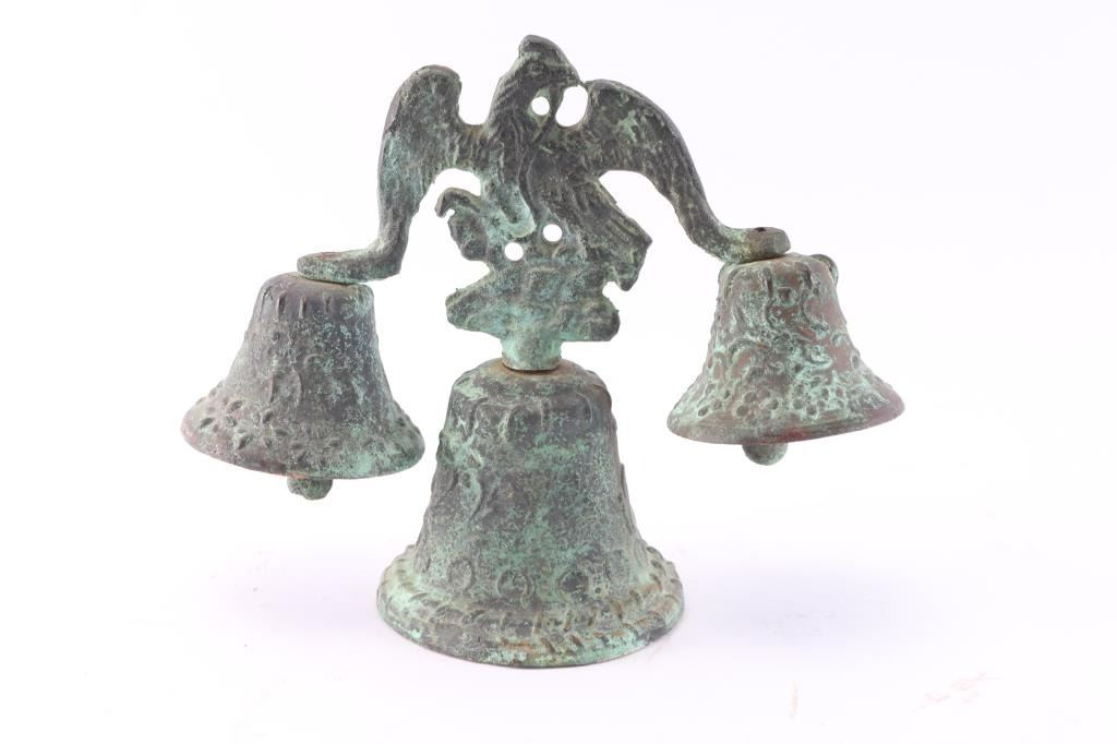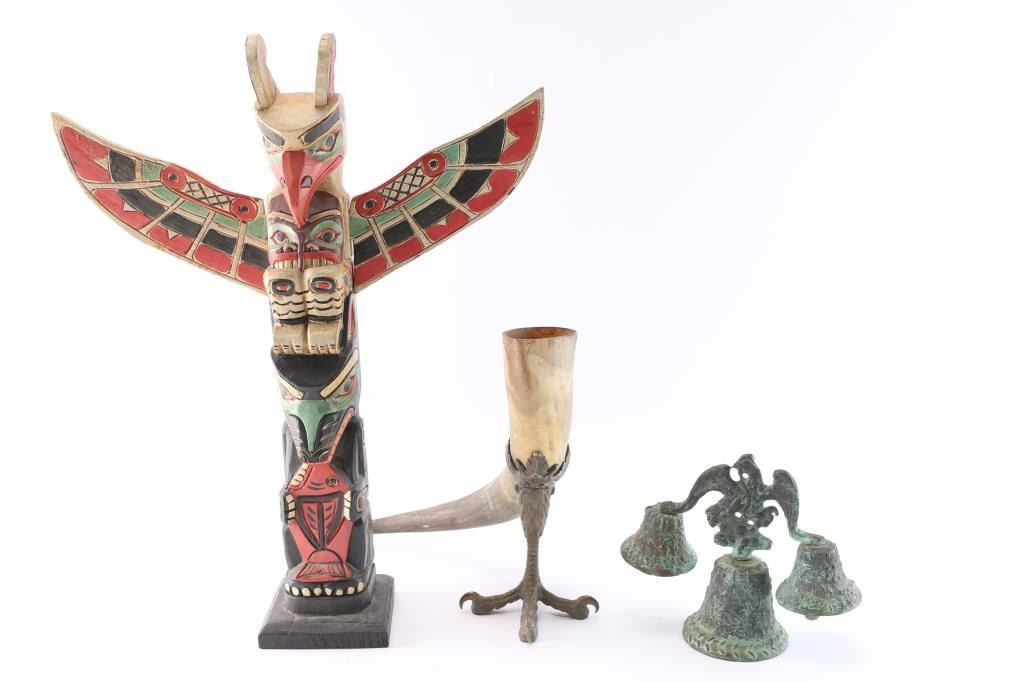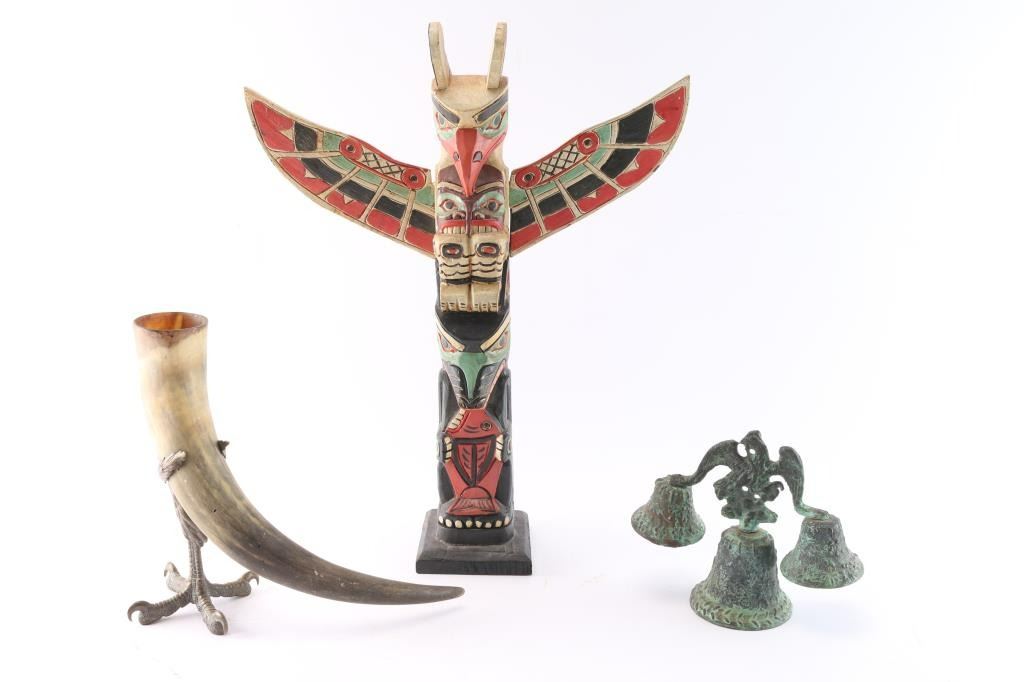 (1) a bronze eagle claw cup holder with horn cup. Measures 10 1/2" tall by 11" at widest. (1) wood carved eagle topped totem pole measuring almost 20" tall by 16" at widest. (1) vintage cast iron eagle 3-chimed bell.