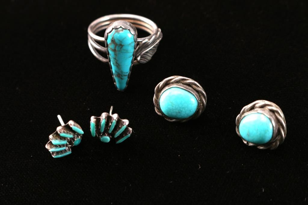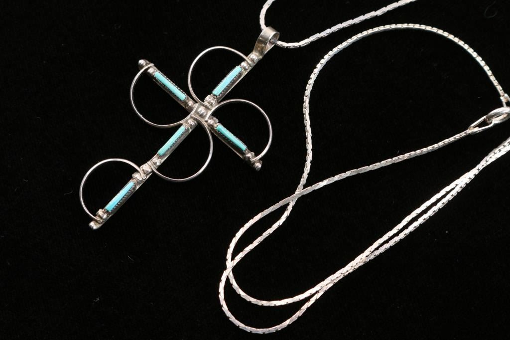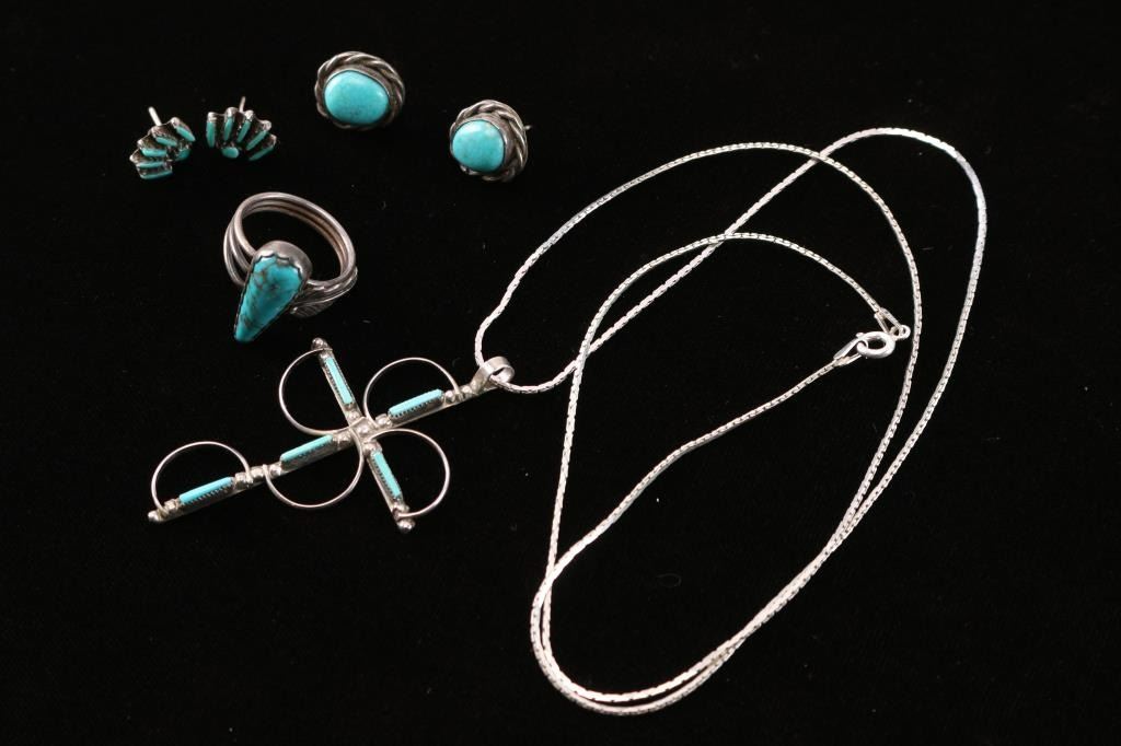 Includes a sterling silver necklace with turquoise & sterling cross pendant. Pendant measures 2", necklace measures 14" from drop. Also includes a tear drop shape turquoise and sterling ring, size 6 1/4" and two pair of turquoise and sterling pierced earrings.