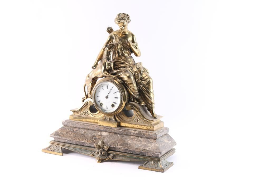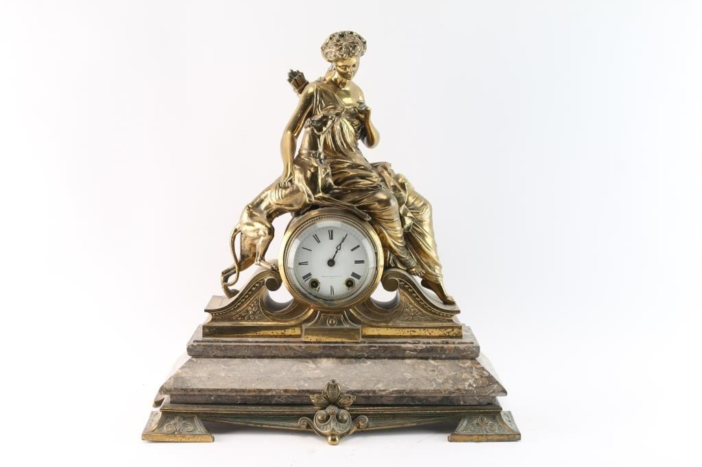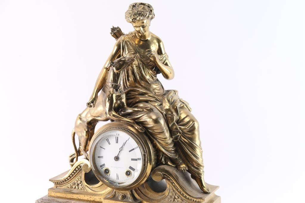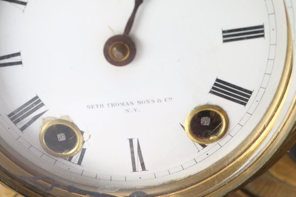 Seth Thomas & Sons mantel clock with woman with dog on marble and brass base. Needs minor repair. Missing pendulum and key. 4" dial. Overall measurement: 17.75"W x 19"H. ***Buyer Must Arrange Shipping***