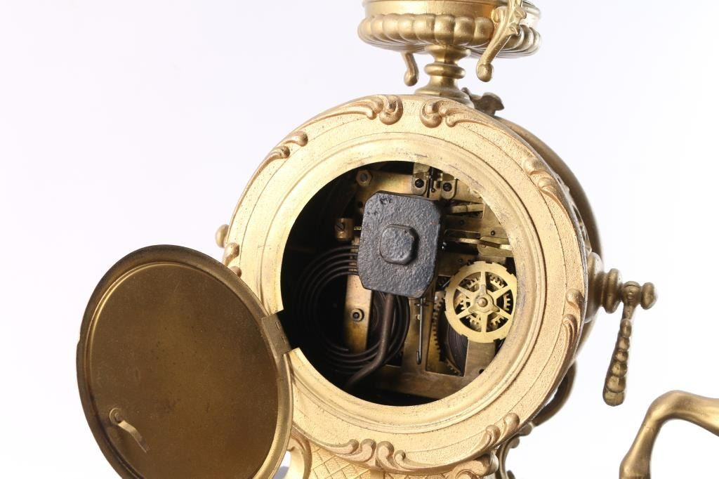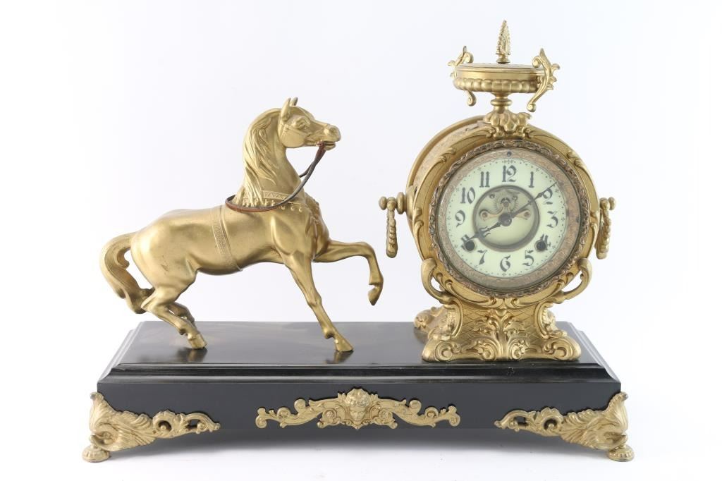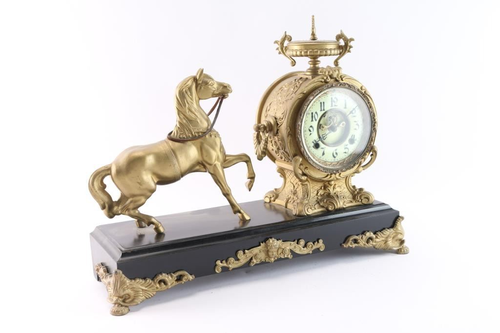 New Haven gilt bronze equestrian mantel clock on black base. 4.5" dial. Overall measurements: 20.5"W x 16"H. **Buyer must arrange shipping.**