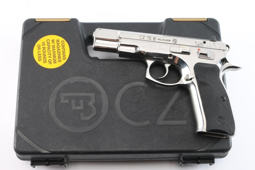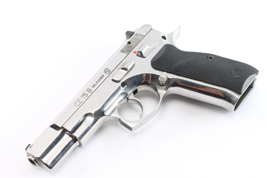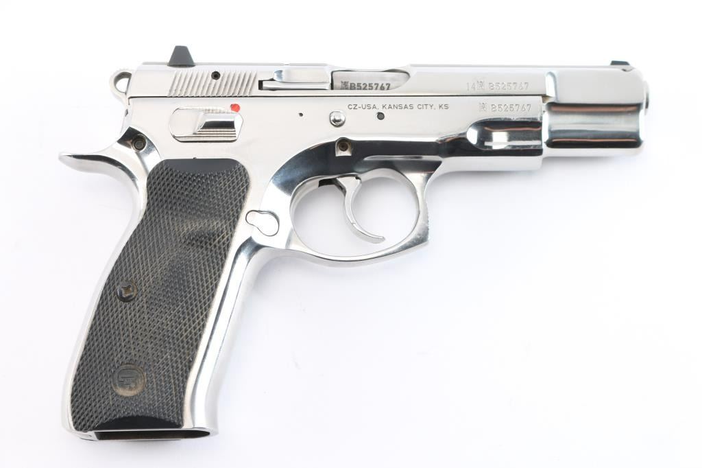 Czech made DA/SA semi-automatic pistol chambered in 9x19mm. Imported by CZ-USA of Kansas City, K.S. with import marks on the right side of the frame. Features a gloss nickle finish, 4.5" barrel, three-dot sights with drift adjustable rear sight, smooth silver look trigger, serrated round hammer spur, frame mounted safety, steel frame, push button magazine release, two-piece checkered black rubber grips with CZ insignias. Bore is very good. Retains 95% finish, with minor handling marks and light scratches. Grips show some dirt, overall very good condition. No magazine, but has a standard 15 rd capacity. Numbers match on frame, slide, barrel.