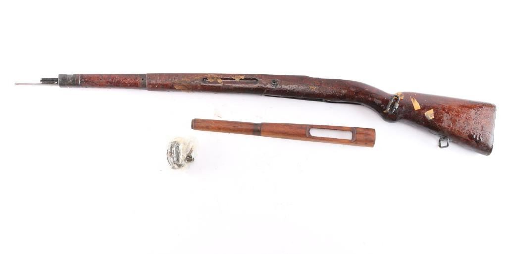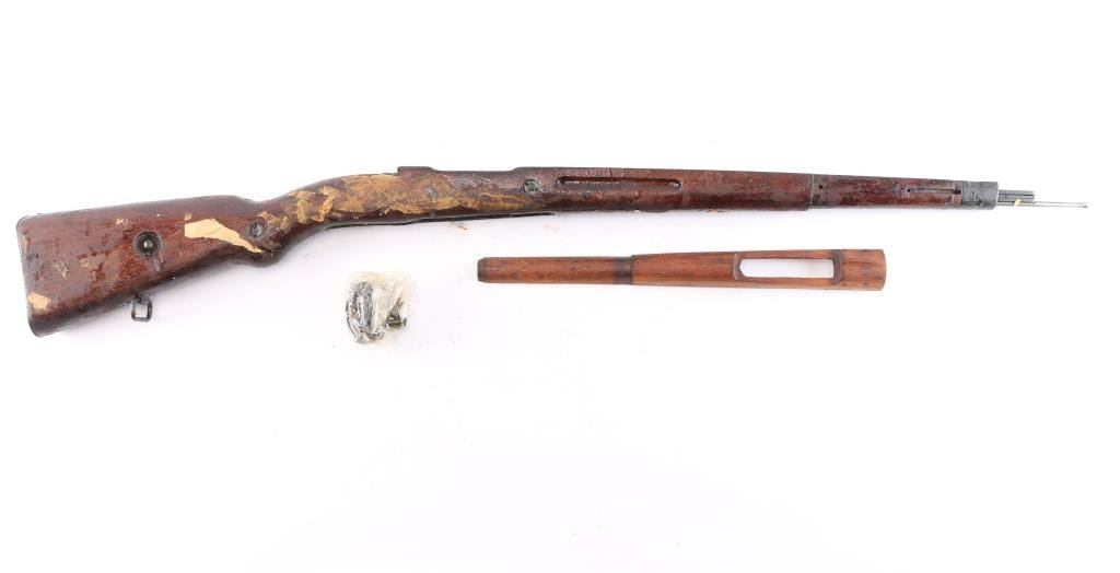 Very clean Mauser wood stock set. Stock is numbered '8455' on the left side of the buttstock, and '1.TRZ' on the right side. It has a sling loop in the front, a bayonet lug, a smooth flat buttplate, matching handguard, and a sling slot cut in the rear. The handguard is marked 8807 on the inside. The wood is in excellent condition with very light handling marks. The end cap, bayonet lug, and sling loop, retain 95% of their blueing. There is a small amount of edge wear on the end cap. The buttplate has no bluing and shows some patina. Late war style.