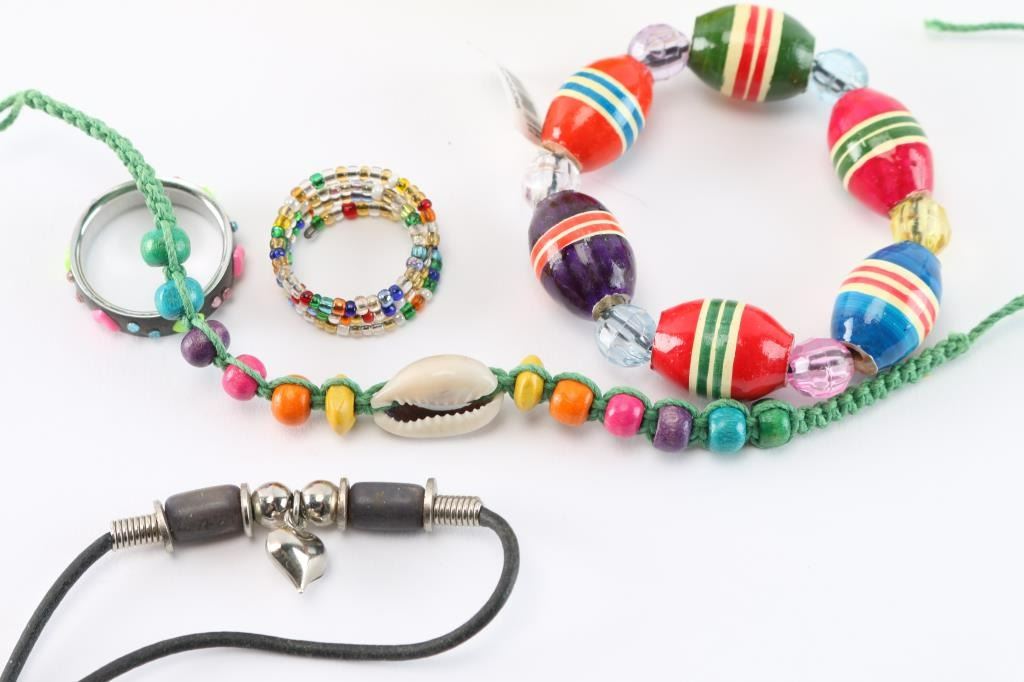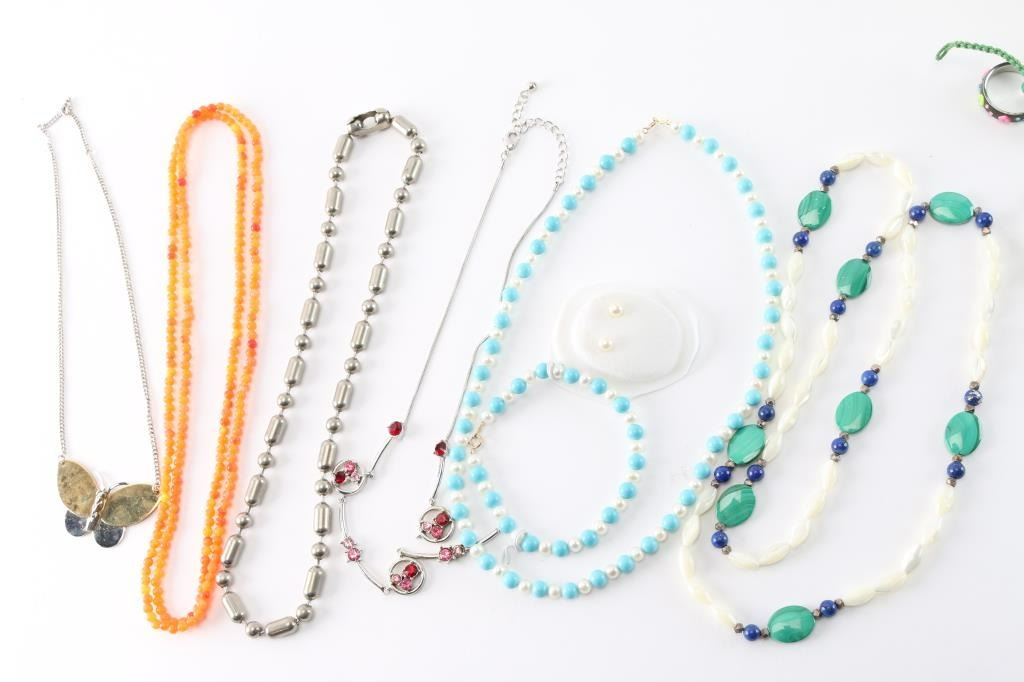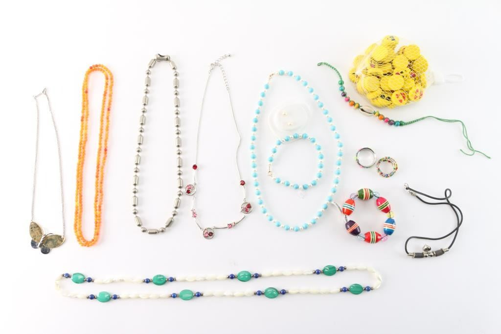 Includes 6 necklaces (two need repair); 2 bracelets; 2 rings; one necklace, bracelet, earring set; and a bag of smiley face tokens.