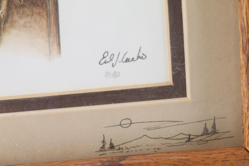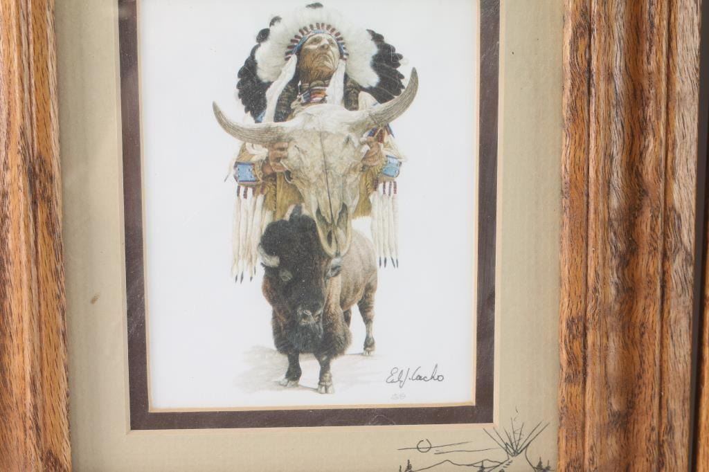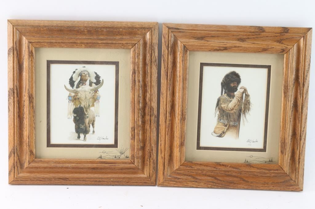 Includes: A print of a Native American Chief wearing a headdress and holding a buffalo skull and a buffalo standing below. A print of a mountain man wearing a fur hat and leaning against his rifle. Prints are signed Earl J. Cacho.