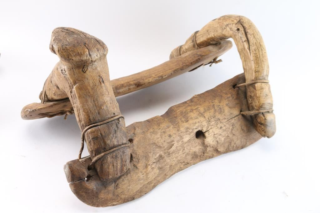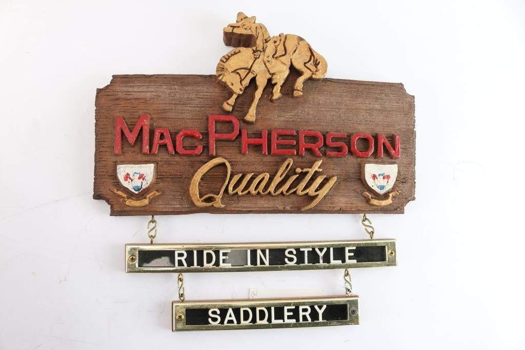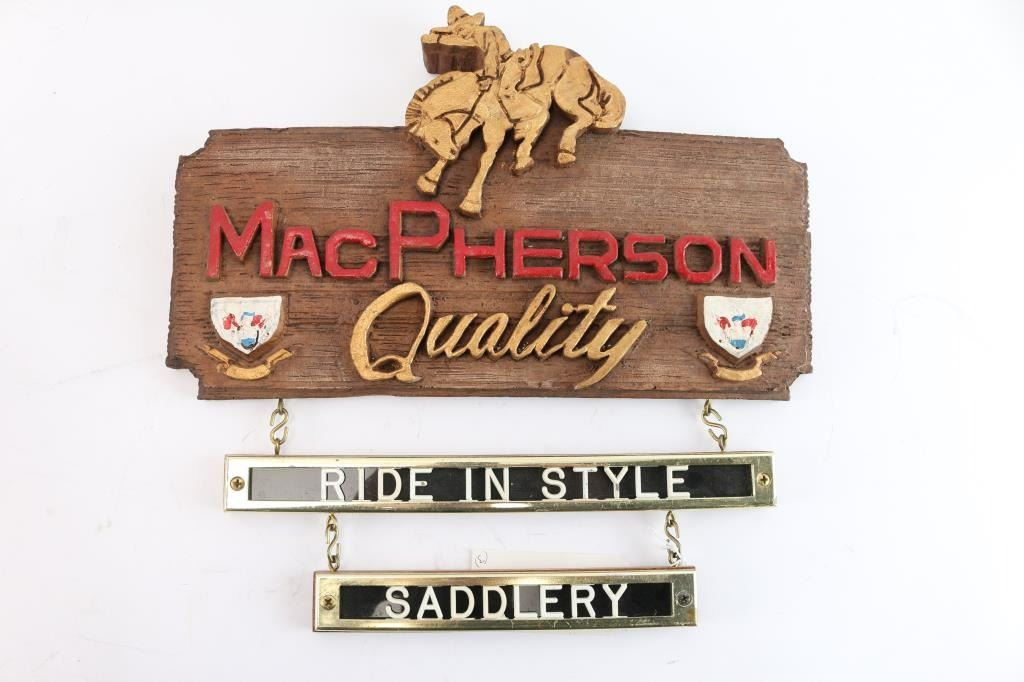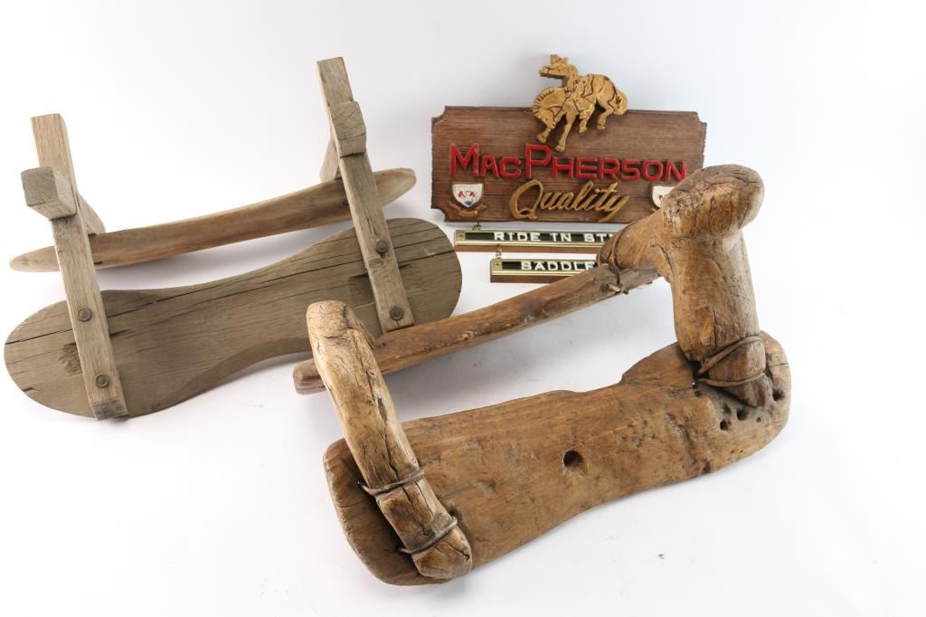 Includes: 2 wooden pack saddles. Measures: (1) 10H" x 19"L x 12"W made of wood and nails. (1) 10"H x 18"L x 11"W made of wood and rawhide. MacPherson Quality Saddlery sign measures 13-1/2"W x 13"H.