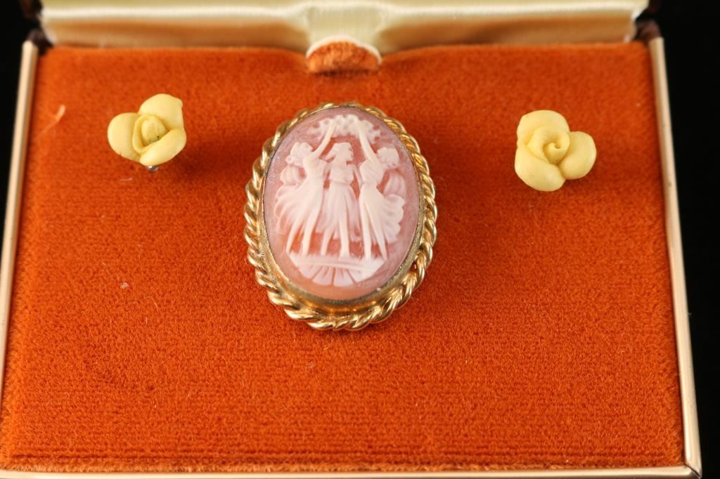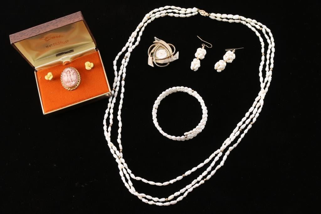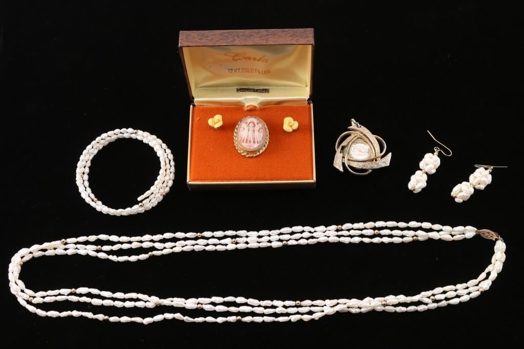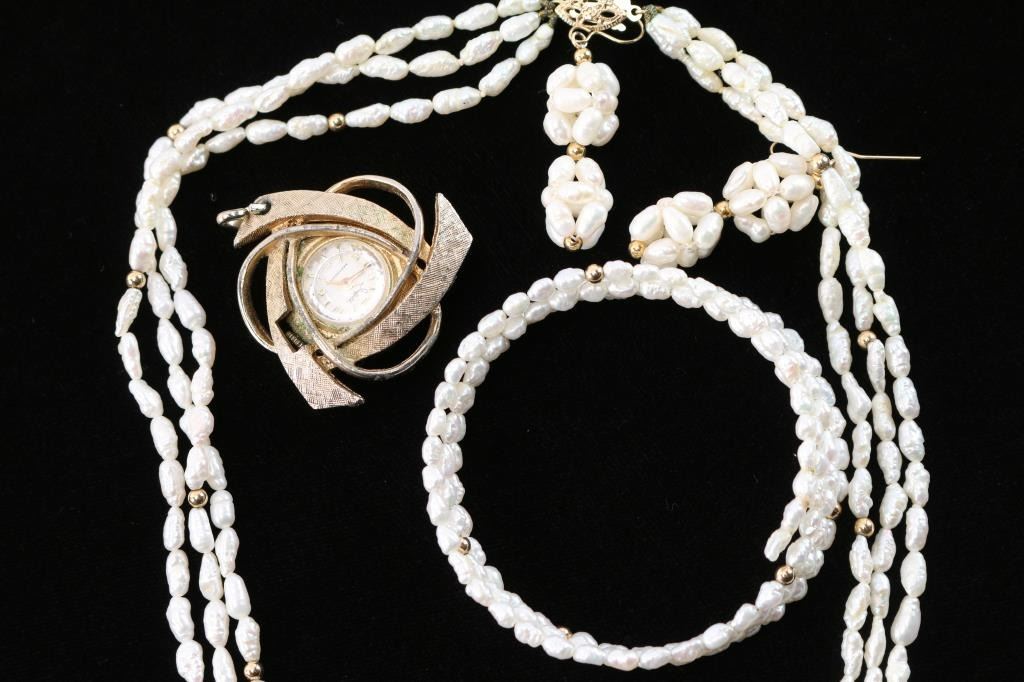 Includes 3-strand freshwater pearl necklace measuring 11 1/2" from drop with matching adjustable bangle bracelet and pair of pierced earrings measuring 1". Also includes a 12k gold filled cameo broach, pair of yellow rose porcelain pierced earrings, and a ladies watch gold tone pendant.