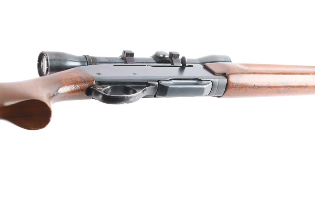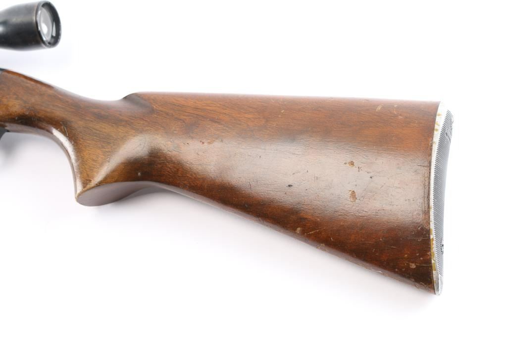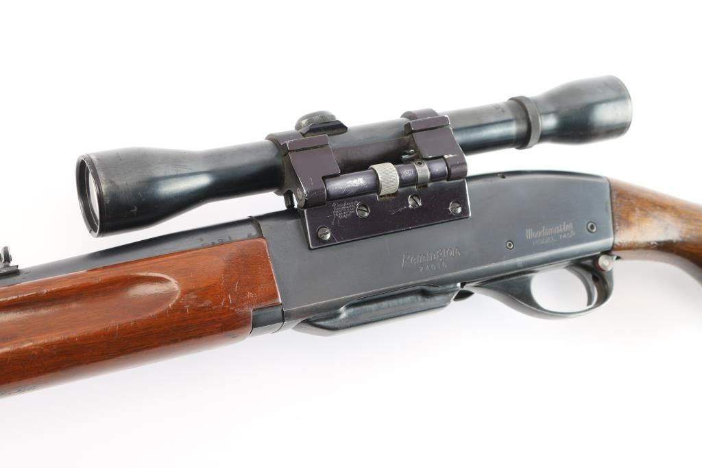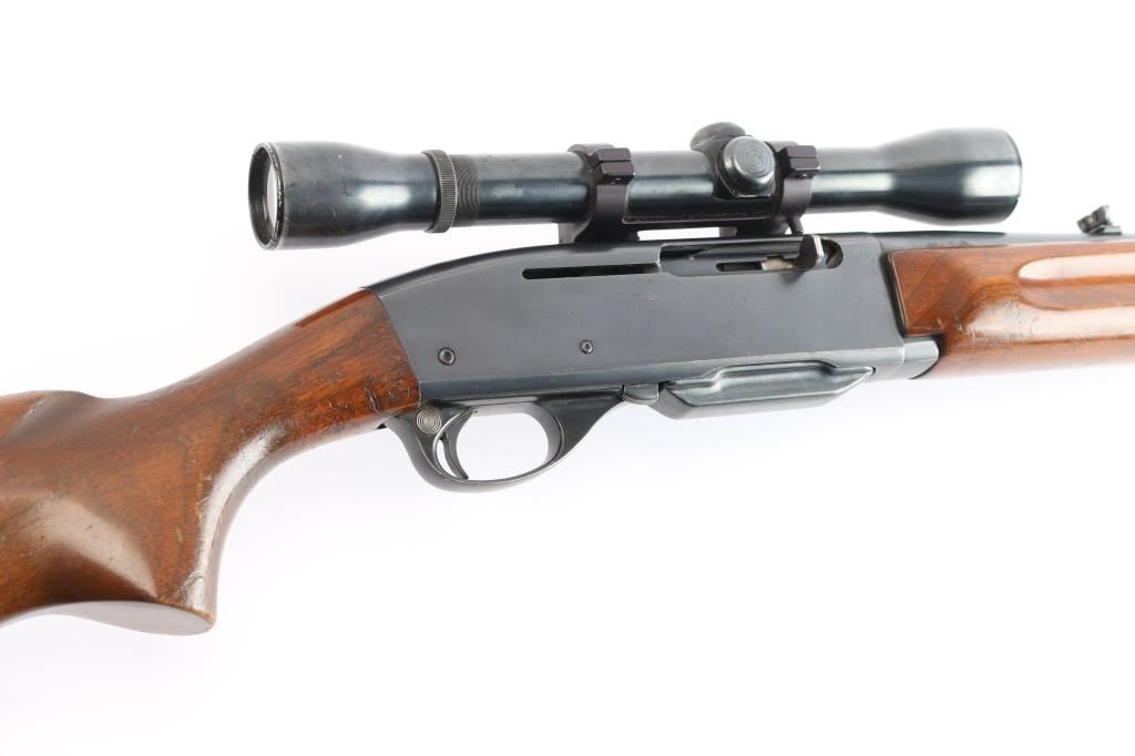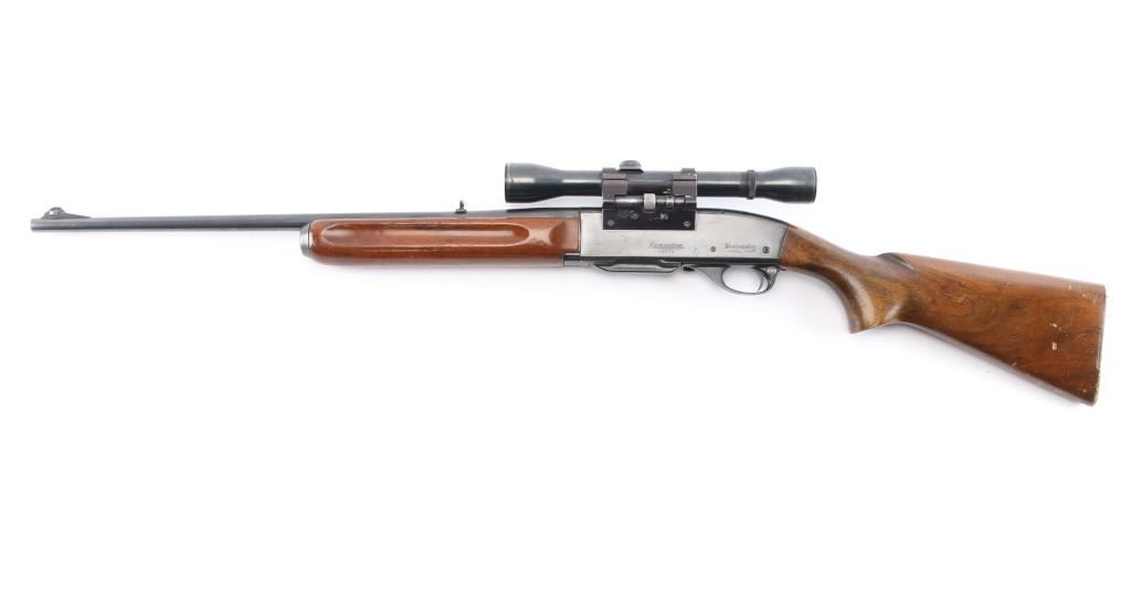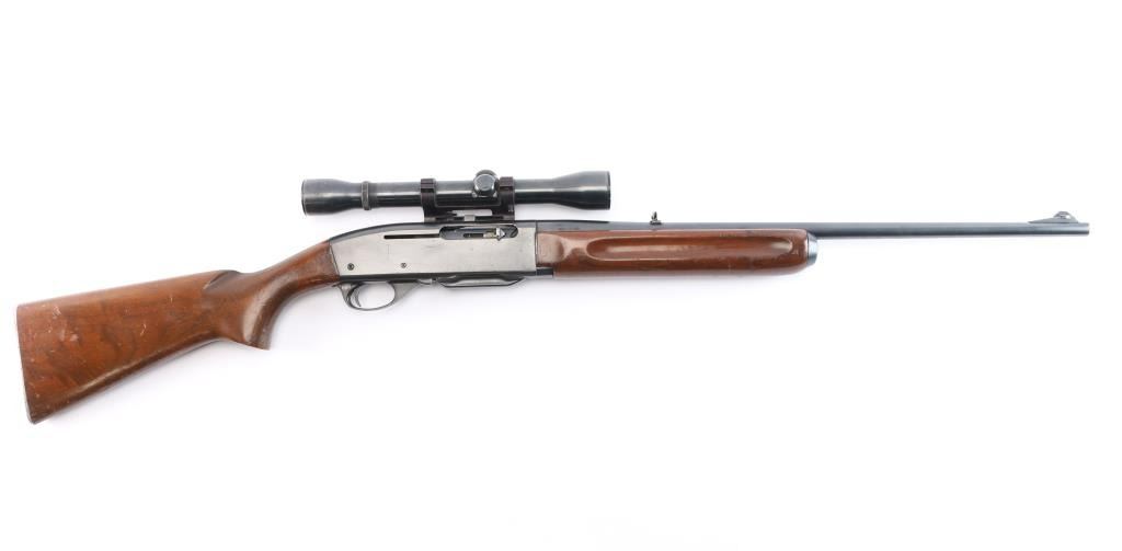 Vintage Remington 'Woodsmaster' magazine fed semi-automatic sporting rifle chambered in .30-06 Springfield. Manufactured in Ilion, NY circa 1955 (Date code LB). It features a blued finish, 22" tapered barrel, ramped blade front sight with bead top, elevation adjustable folding rear sporting sight, Weaver fixed 4x with fine fine crosshairs and dot, smooth curved trigger, alloy trigger guard with cross-bolt safety, detachable 4 round box magazine, smooth walnut forend with gasping grooves and semi-pistol grip shoulder stock with serrated metal buttplate & 13 ½” LOP. Rifle retains approximately 80% of its original blued finish showing light wear around the receiver, and buttplate (more significant). There are a few scattered spots of emerging rust on receiver, along barrel, end-cap, and front sight post. Action is crisp, the bore is dirty, but with good rifling and showing some patina. The optics are slightly hazy with the finish worn on the scope and mount. The wood stocks are good with heavy handling marks, but has no cracks.