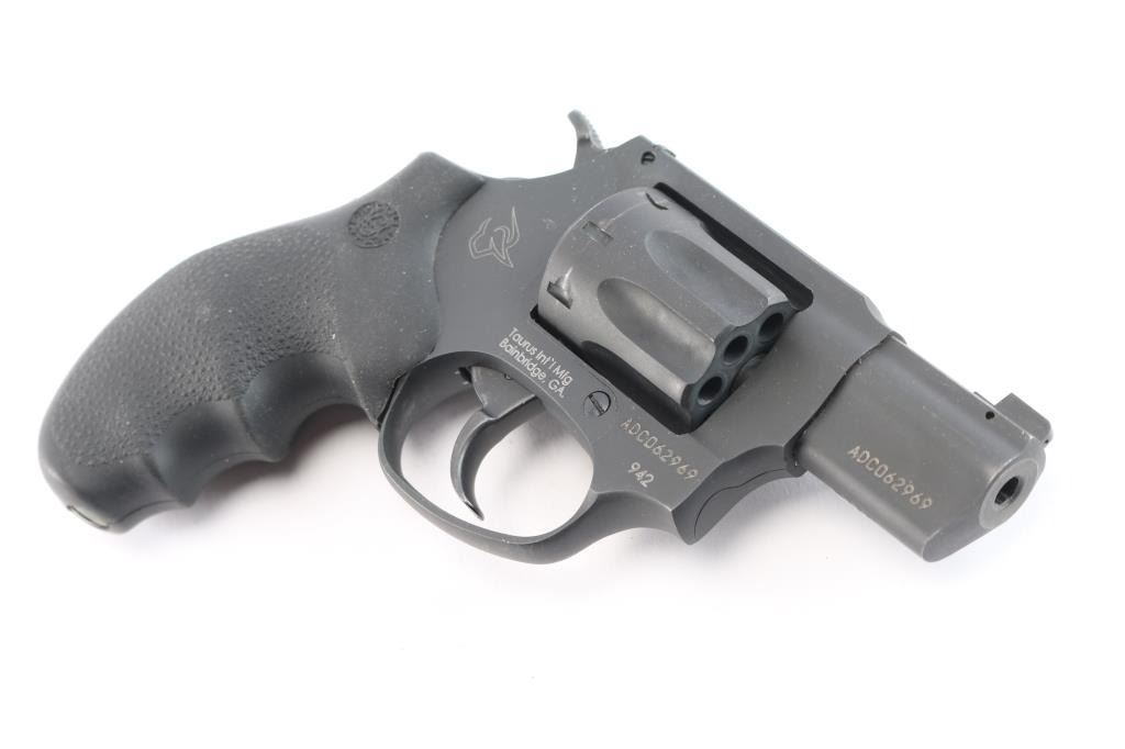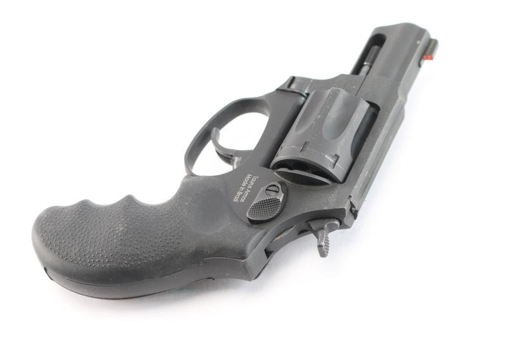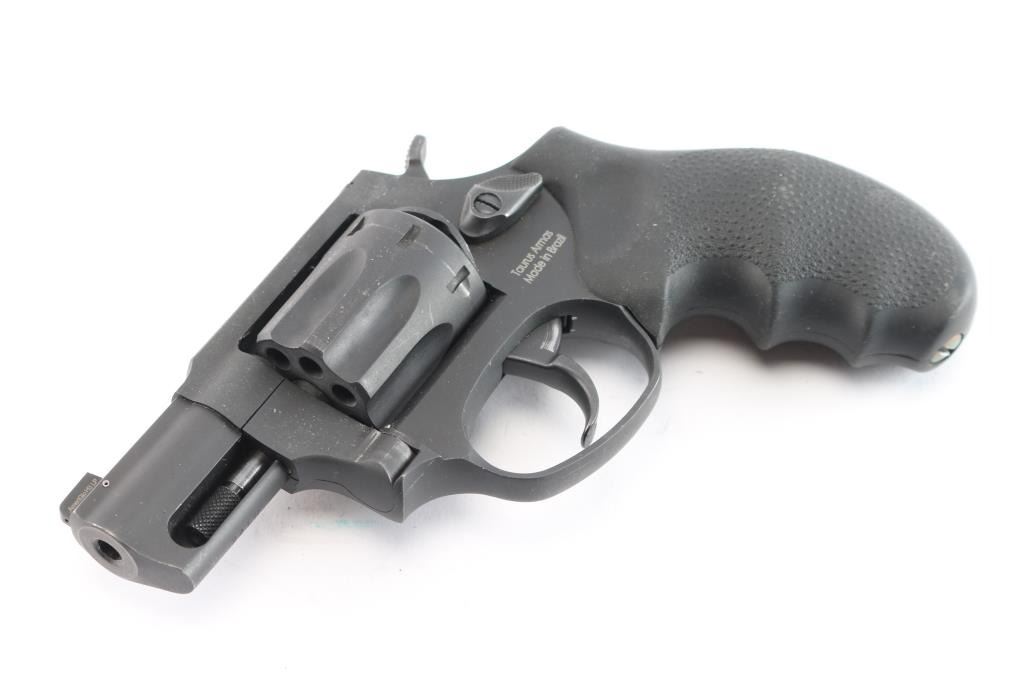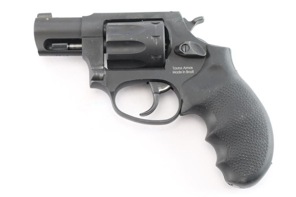 Taurus DA/SA revolver chambered in .22 LR with a 2" barrel manufactured in Brazil and imported by Taurus Int. Mfg., Bainbridge, GA. It features a blued-steel finish, an 8-shot cylinder, a polished ejector rod, and a smooth curved trigger. It also has a drift-adjustable blade rear sight, a pinned Ameriglo front sight (very dim), full underlug, compact rubber finger grooved Hogue grip, checkered hammer spur, and passive firing pin. The blued finish is about 95% with minor handling wear, drag marks on the cylinder, a light scratch on the right side of the barrel, and edge wear towards the muzzle. The bore condition is bright with strong rifling.