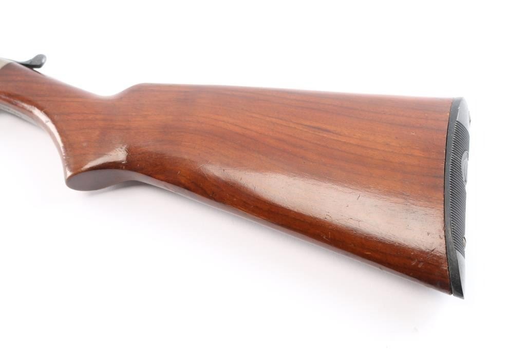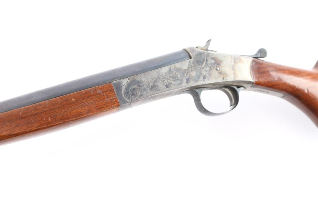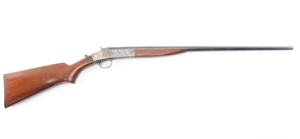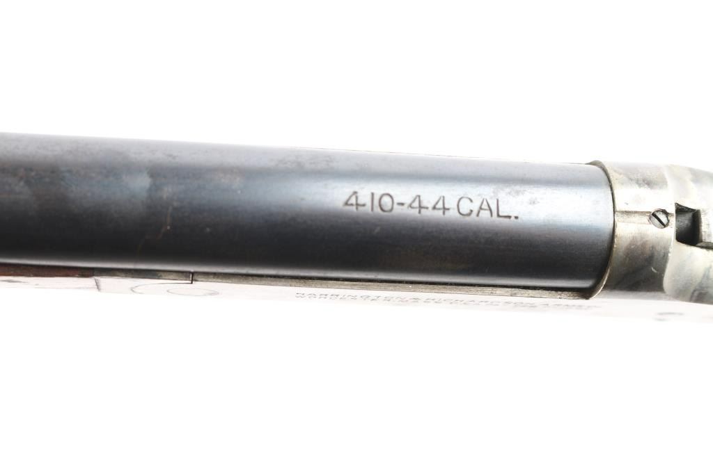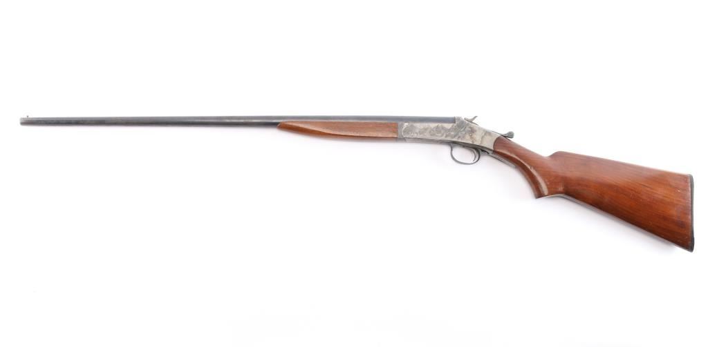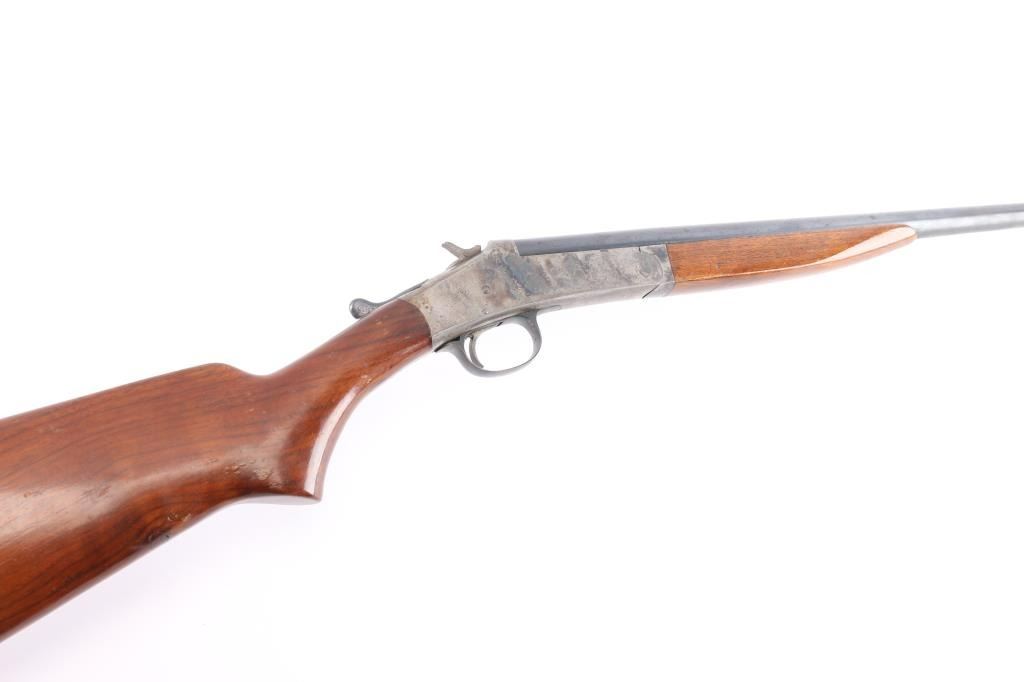 Single shot box lock Harrington & Richardson break barrel shotgun manufactured in Worcester, MA circa 1940 ('A' prefix). It has a 410 gauge, or .44 caliber chamber. It features a 26" barrel, brass bead, blued finish, color case receiver, plain wood semi-pistol grip stock with plain forend, single smooth curved trigger, extractor, splinter forend, and plastic grooved buttplate. The chamber measure 2.5 inches, and the bore measures 'M' with a drop-in gauge. The barrel and receiver have matching serial numbers. The wood is very good with some handling marks around the grip, bottom and rear of stock. The original blued finish is approximately 75% with most of the wear towards the muzzle, and it shows some patina throughout. The receiver finish is approximately 65%,showing patina on the bottom and top tang.