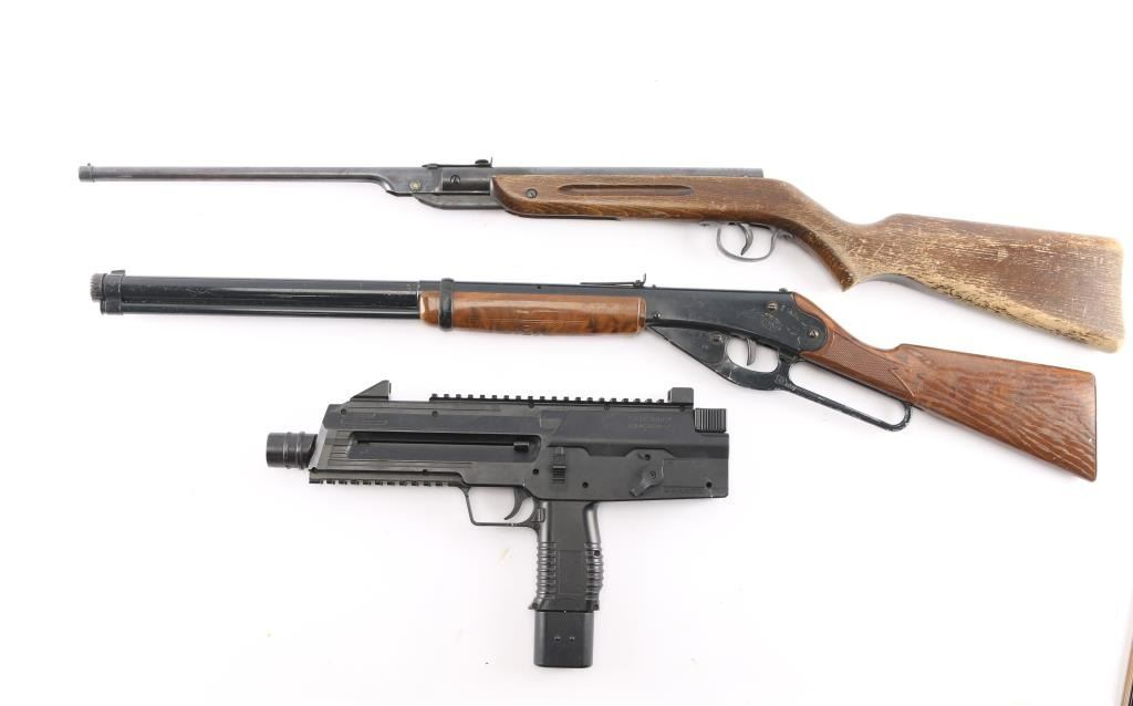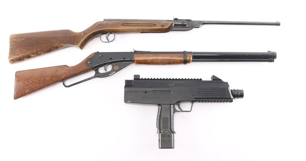 1) Rare Daisy model 220 made in Scotland, circa 1968-70, .177 cal, break barrel air rifle. Blued finish displays small scattered rust spots and pin prick pitting, worn wooden stock. Good working condition. 2) Daisy model III, Red Ryder lever action BB air rifle, first introduced in 1940. Simulated plastic wood butt stock and handguard. Scratches, action wear on lever and loss to finish. Good working condition. 3) Umarex Steel Strom 6-shot auto burst BB gun, powered by dual 12 g CO2 capsules, placed in drop-out magazine. Good condition.