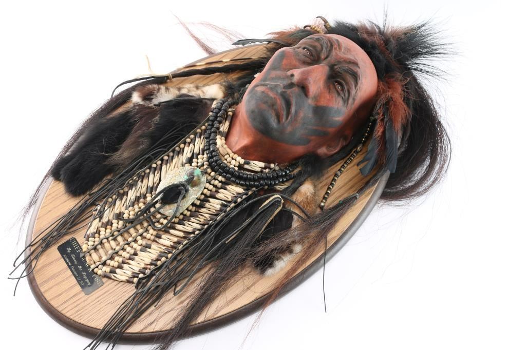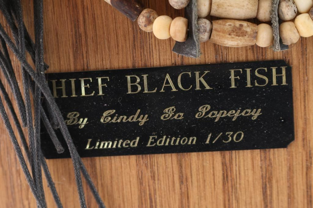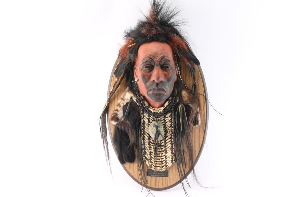 Titled "Chief Blackfish", #1/30, Spirits From The Heart. From the artist: "For more than thirty years, I have immersed myself in the study and creation of Native American art. My love for the narrative beauty of Native American culture, as well as a desire to honor my Cherokee heritage, has driven me to understand and represent the character, strength, and honor of Native American people. I am a self-taught artist, competent in ceramic, clay, bronze, and other mixed media, and I am meticulous in researching and understanding the subject matter I represent with each of my pieces. My intent is always to make my art speak to my audience. If eyes convey emotion, posture portrays movement, and detail portrays a story, then I know my pieces are conveying the stories I wish to tell with each one. My work and business accomplishments have been recognized both locally and throughout the Mountain West. I have been highlighted in magazines such as Cowboys & Indians and Western Art & Architecture, and my various awards and business endeavors have been recognized in local publications such as the Idaho State Journal and the Blackfoot Morning News. I independently owned and operated my own business, From the Heart of Idaho, where I sold my own artwork as well as that of various other local artists. I took great pride in showcasing my talents and providing an avenue for other developing artists to thrive." Comes with Certificate of Authenticity.