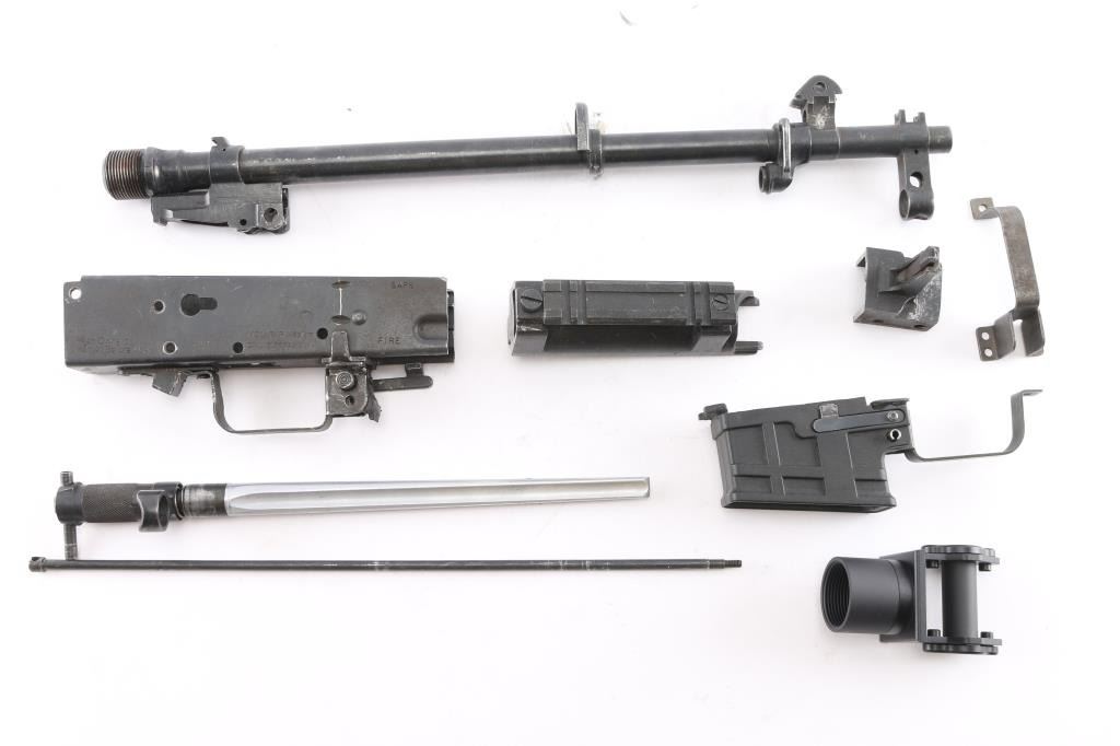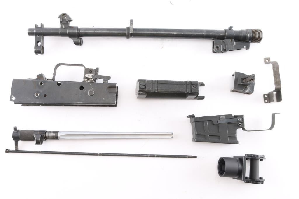 Various gun parts (PAP M85NP trigger housing, magazine well w/ trigger guard, SKS barrel and bayonet, and more.