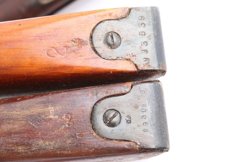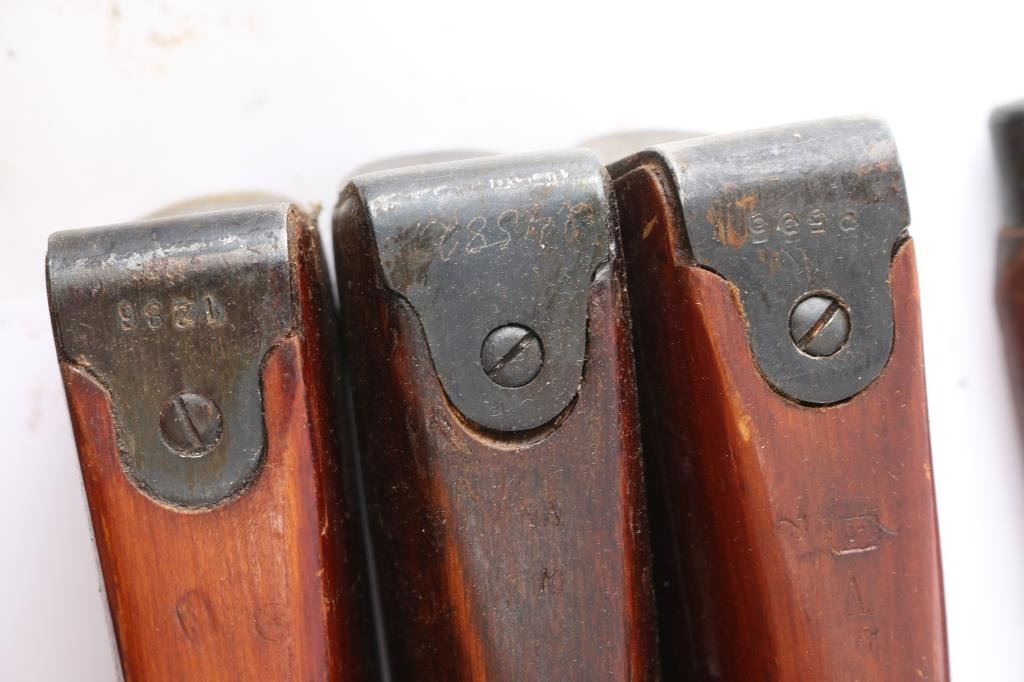 5 complete stocks w/handguards, including metal parts, ie. barrel bands, recoil bolt and nut, serialized butt plate and more. All in good condition.