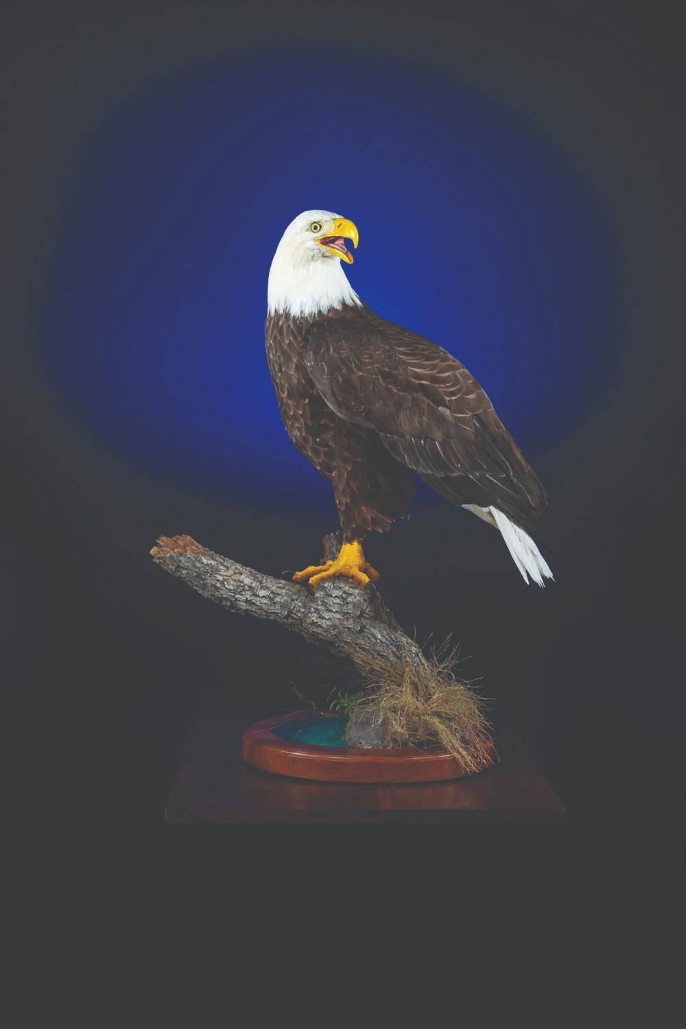 This incredible donation is a standing re-creation bald eagle with habitat on walnut