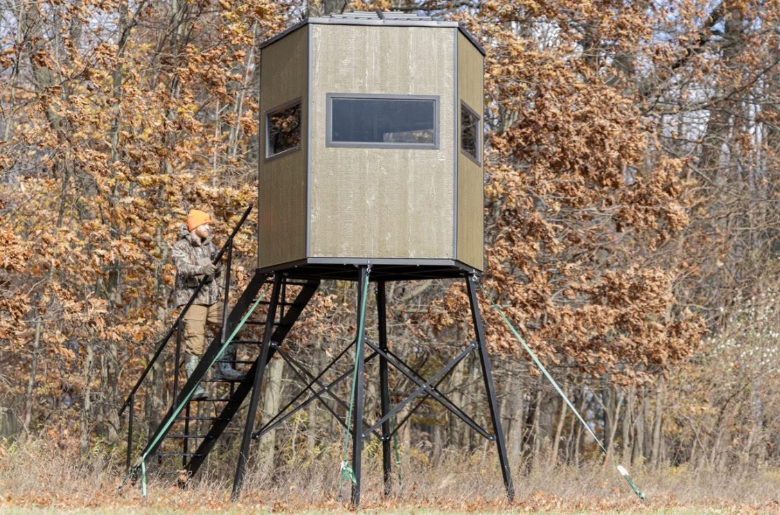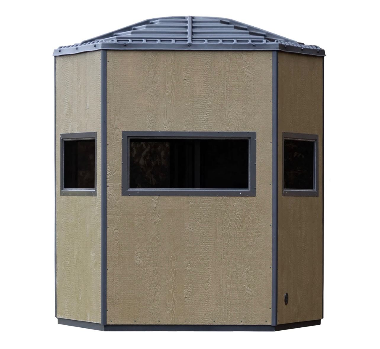 The Slayer Blind is a 5-sided blind with horizontal gun windows that can be used for gun or archery hunting. This is a permanent, hard-sided hunting blind that is also modular. All 5 sides and the base can be taken apart and moved in minutes. The walls and base are fully carpeted to provide a quiet and comfortable interior. The side walls are 6’6” tall, the center ceiling height is 7’3”, and the interior floor plan measures over 6 feet from point to point. LP SmartSide composite exterior, and an aluminum frame made in Michigan. This item will be displayed at the Fundraiser. Tower or accessories shown in pictures are not included!